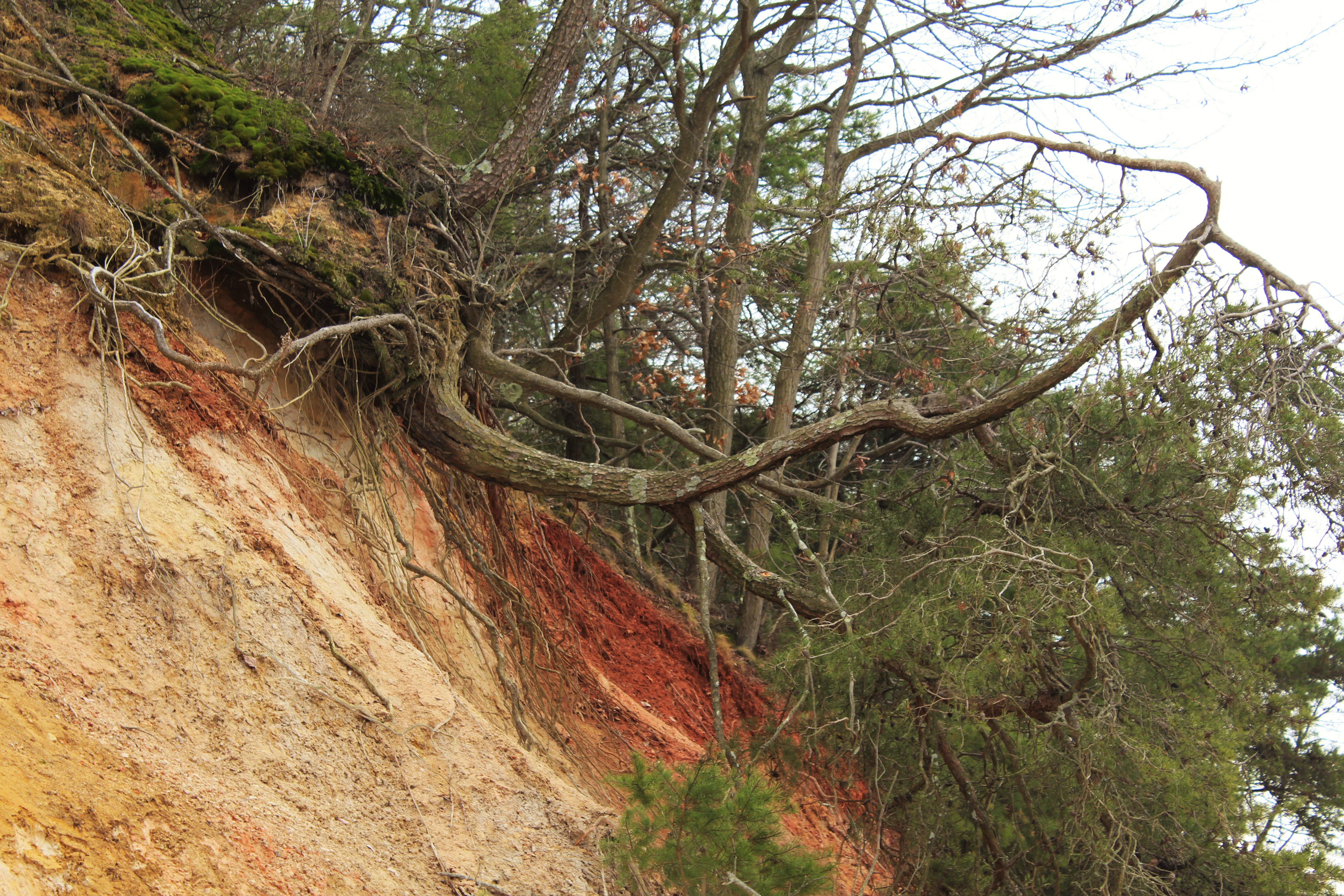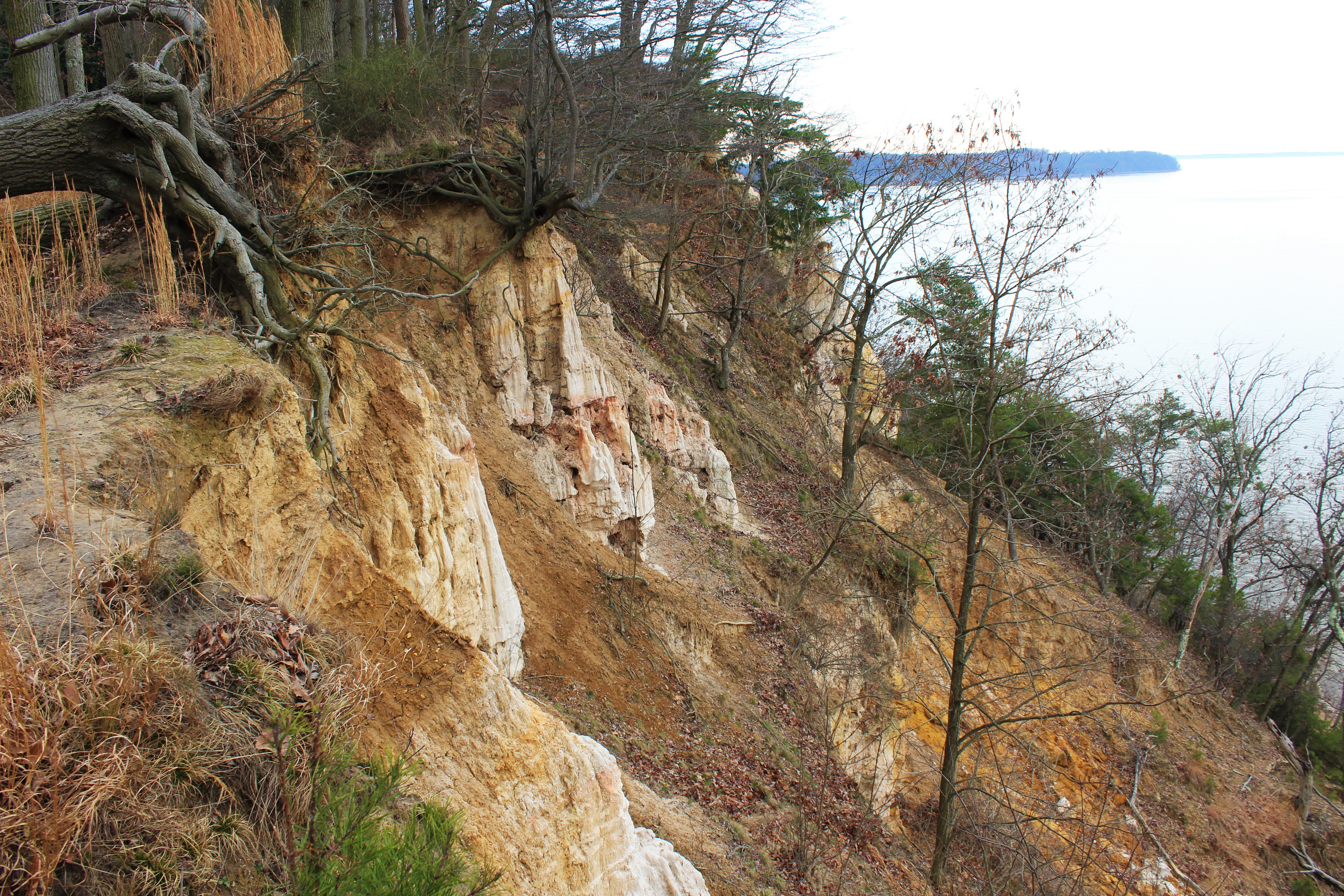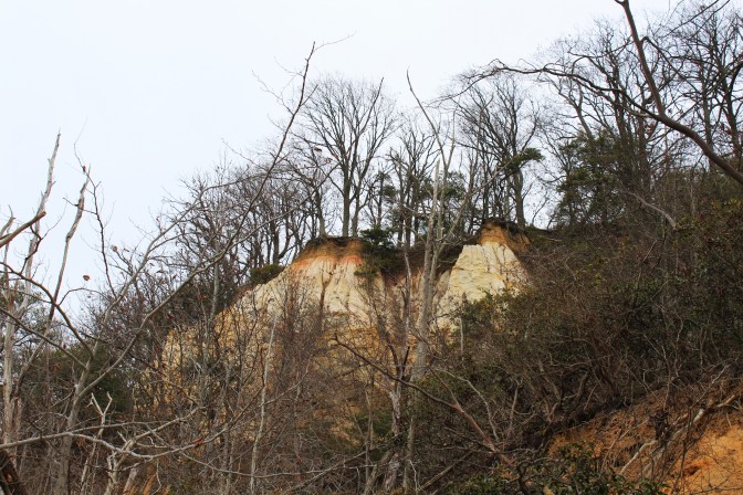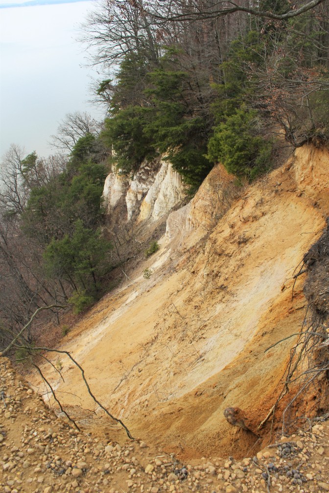 Fortunately, at least as far as people falling to their deaths is concerned, the White Banks are not an especially popular part of Elk Neck State Park. For one, you have to walk a few miles to get to them, on a trail which the park brochure designates as “difficult” …a relative term, though the trail does climb a 200-foot mound of unconsolidated sediment optimistically called Mauldin Mountain, and even features a few switchbacks.