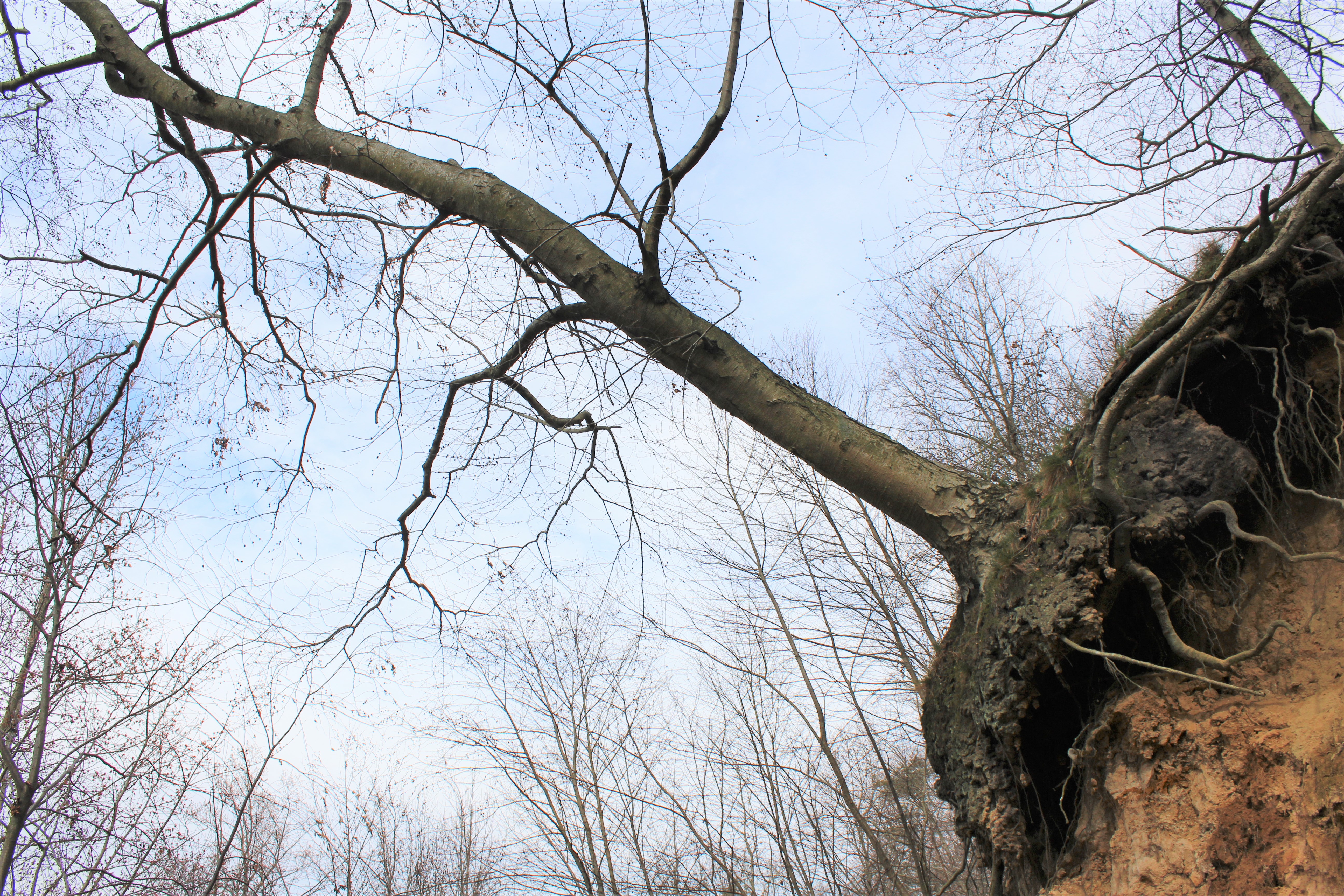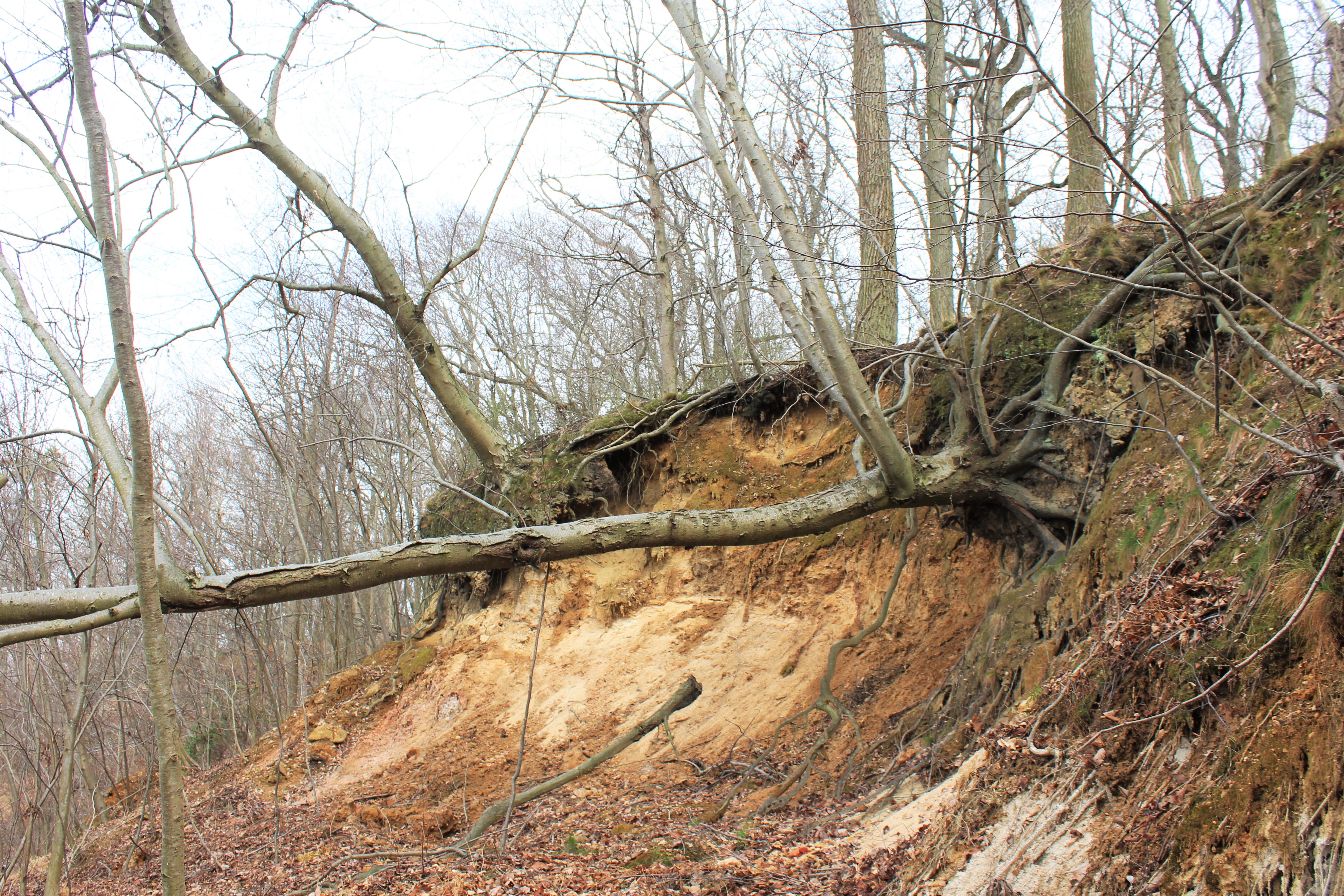 Above: These give you an idea of just how unstable the White Banks are. Though they are covered in dense woodland, much of that woodland is in danger of tumbling over the sides of the quickly eroding cliff-faces. Not that the trees don’t cling to life as long as possible. While the one in the photo on the left is clearly in a precarious situation, note how it’s started to grow branches vertically from near its base. It must have started leaning like that quite some time ago and then remained reasonably healthy despite its change in angle.