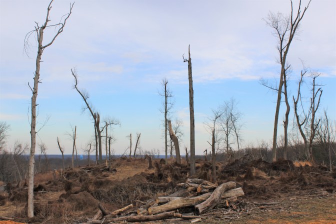 The tornado is thought to have started as a waterspout in the Chesapeake which then made landfall just north of the White Banks, moving up a ravine on the flank of Mauldin Mountain and then proceeding to cut a third-of-a-mile-wide swath of destruction northeast across the Elk Neck Peninsula. While the tornado wasn’t especially powerful (and didn’t cause any fatalities), it downed hundreds of trees, damaged several buildings, and wrecked a large portion of Elk Neck State Park’s trail network.