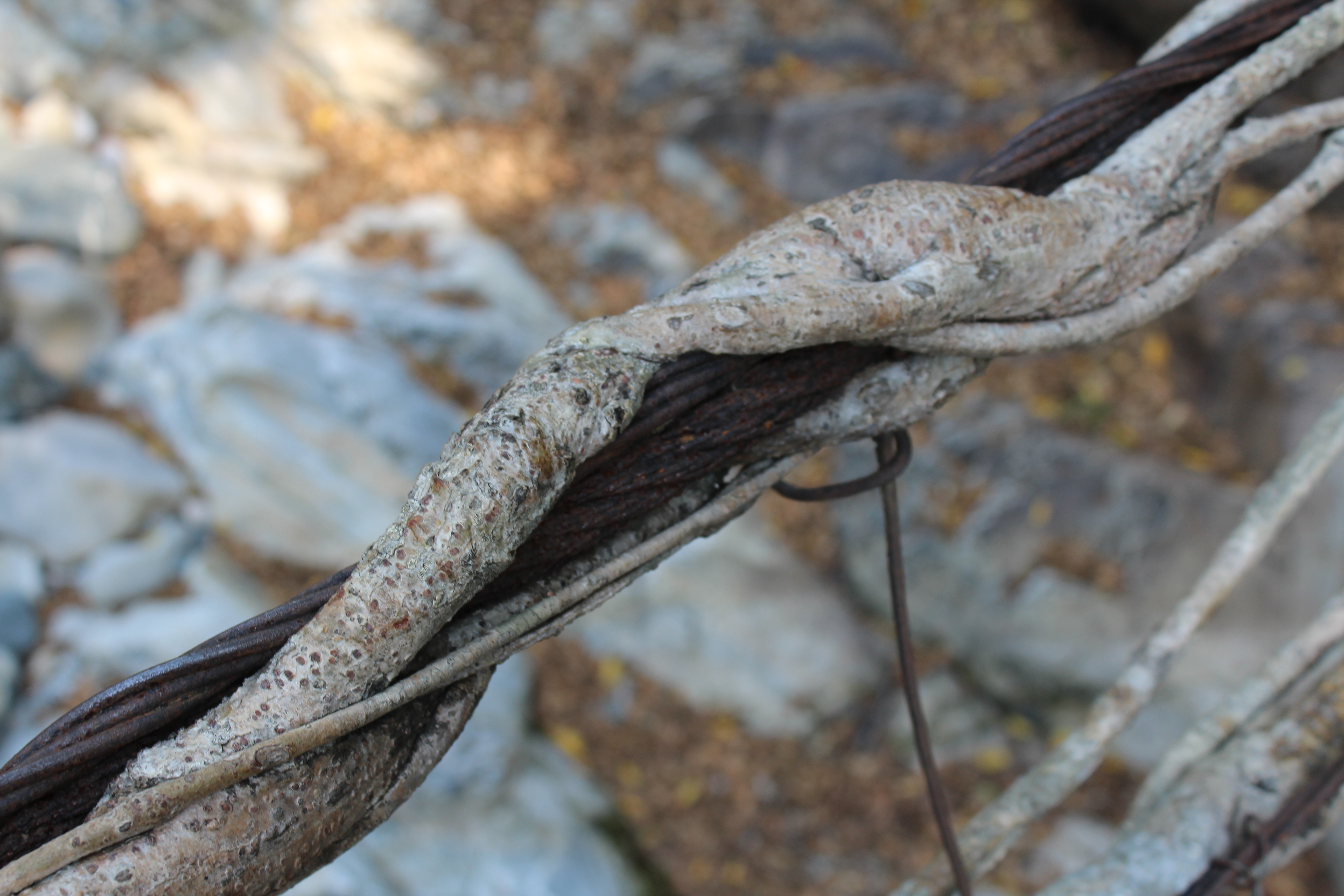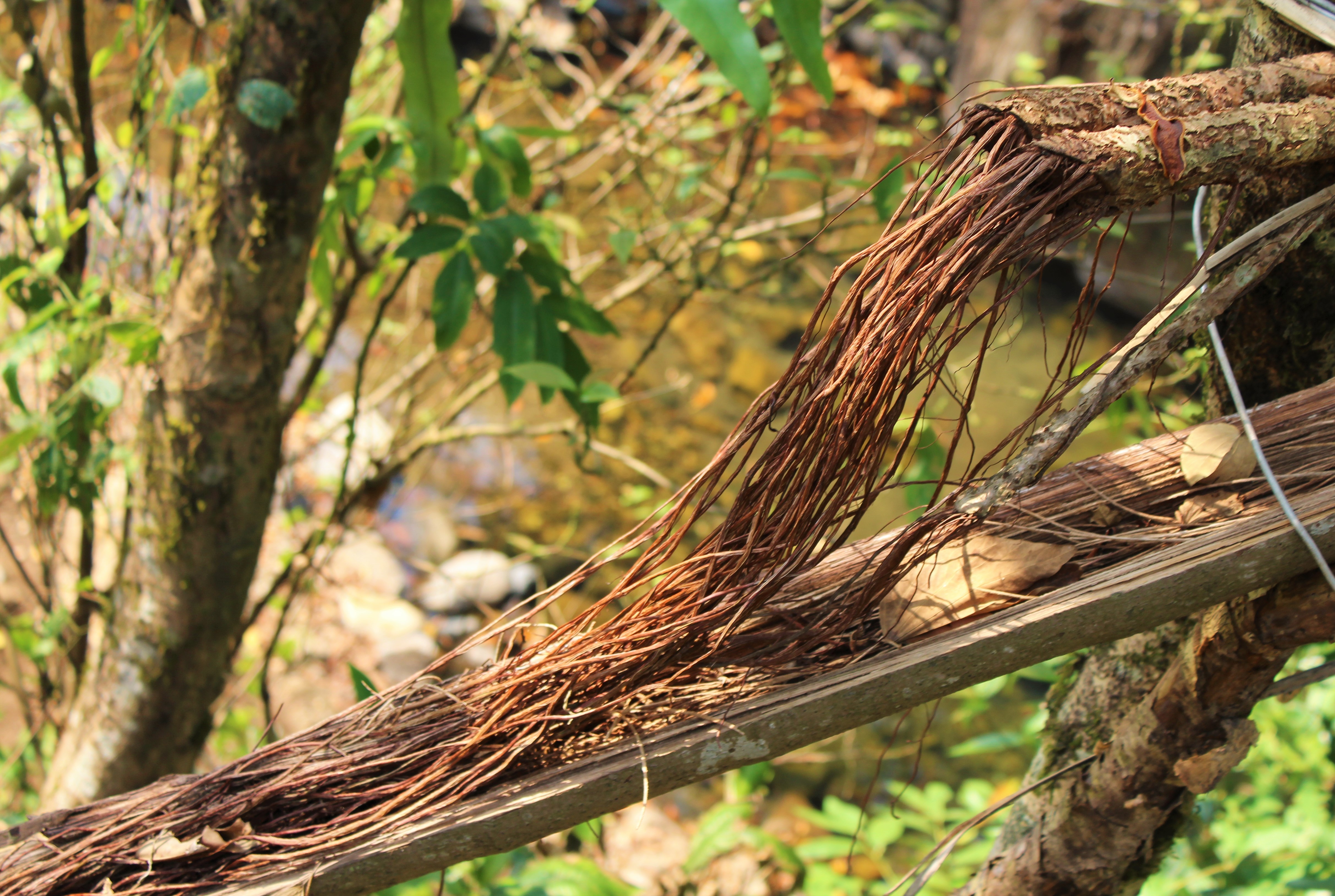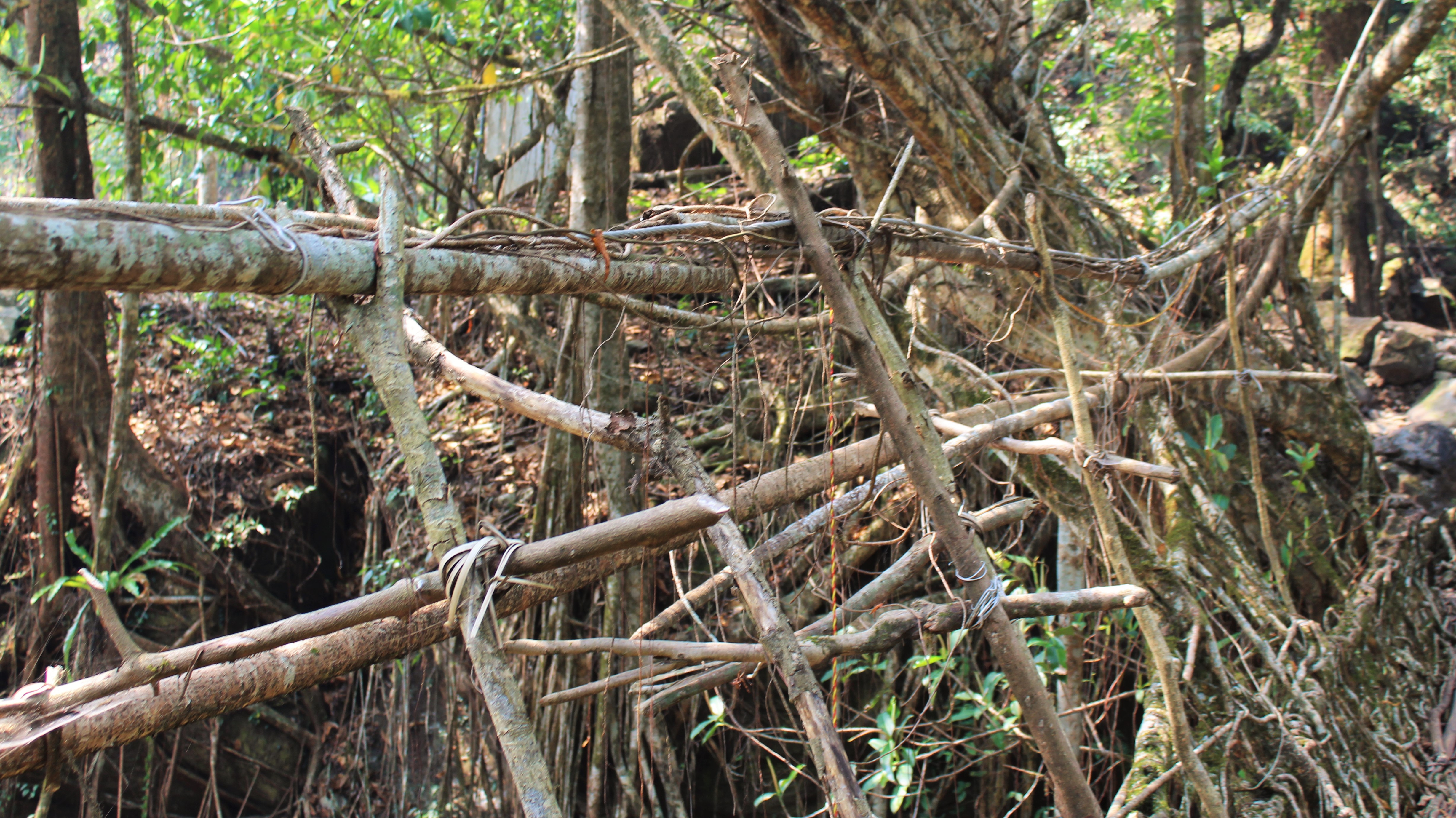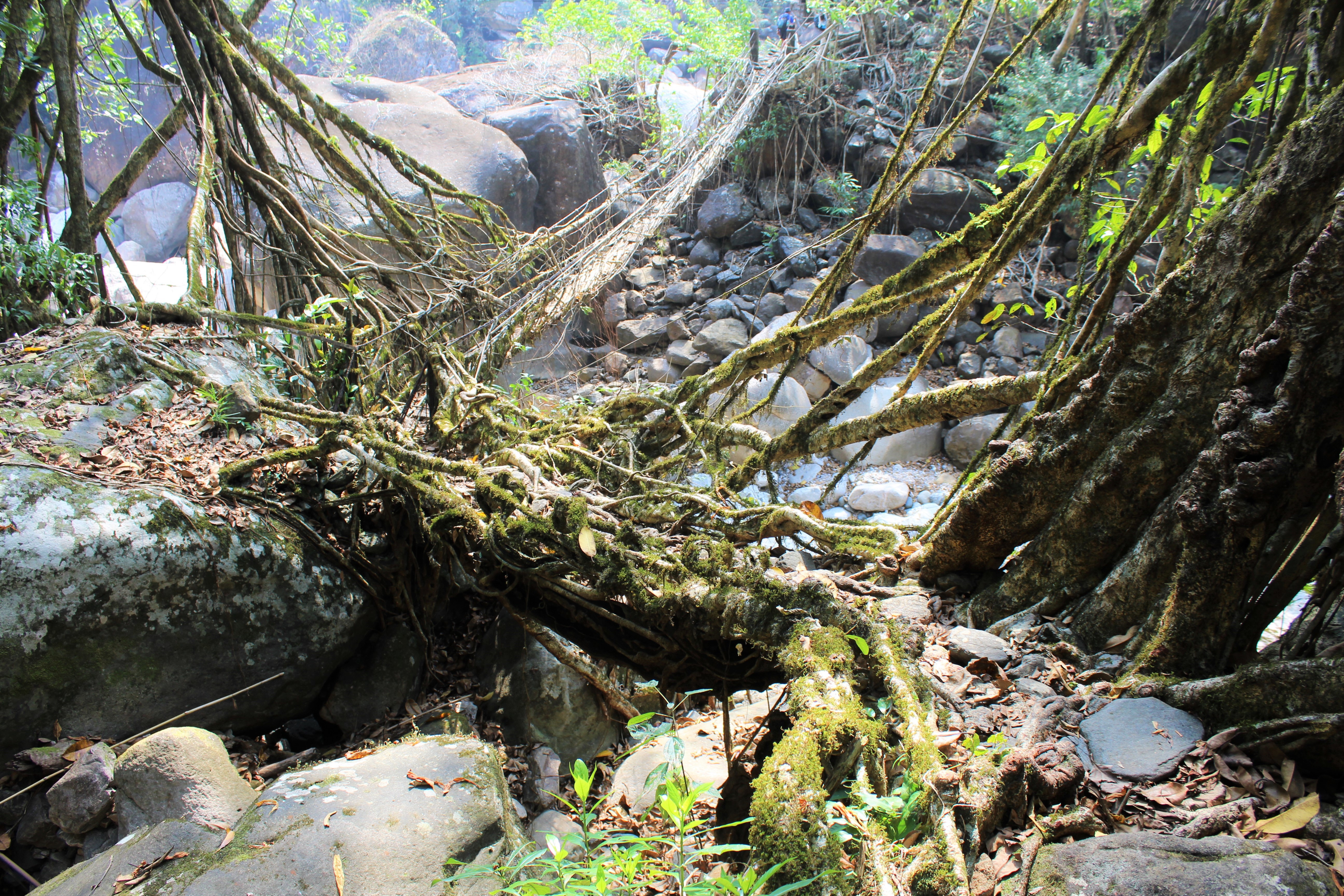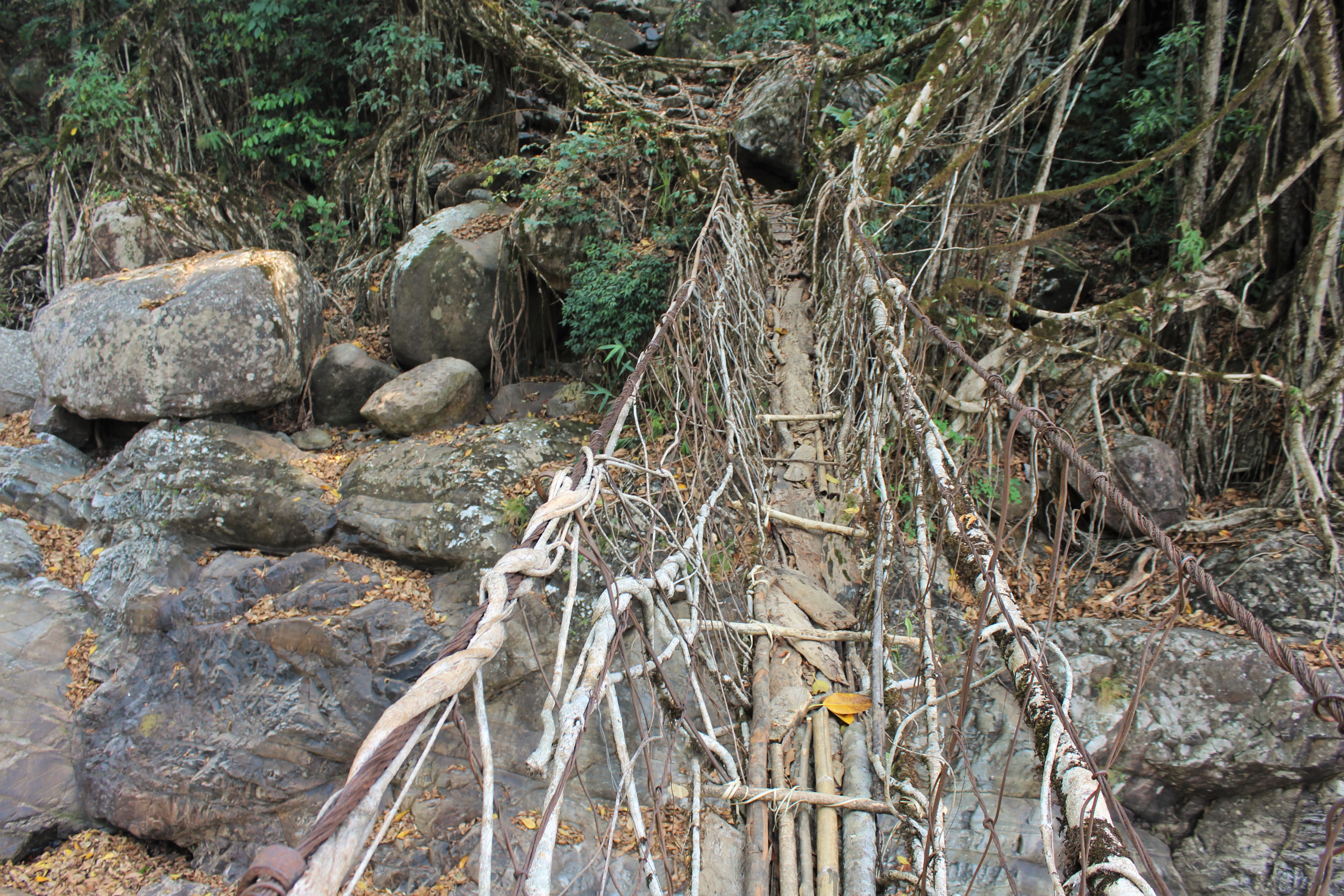 In some ways, the most interesting living bridge in Nongriat is one of its least visually striking. This is a structure made of steel and ficus roots to the north of the village, in the direction of Nohkalikai falls. It’s a bridge which I intend to write more on in a separate post, but in brief, what makes the hybrid of Nongriat so exceptional is that it combines quickly corroding, but convenient, steel cables with long lasting ficus roots. Perhaps the biggest disadvantage of living architecture is that it can take years for the roots that make up the structures to grow strong enough to become functional. But if you take living roots and then train them out over an easily built conventional steel or wood bridge, you circumvent this issue. As the conventional bridge decays in the harsh climate of the Khasi Hills, the roots become stronger, until they can absorb all the stresses the conventional bridge once took.