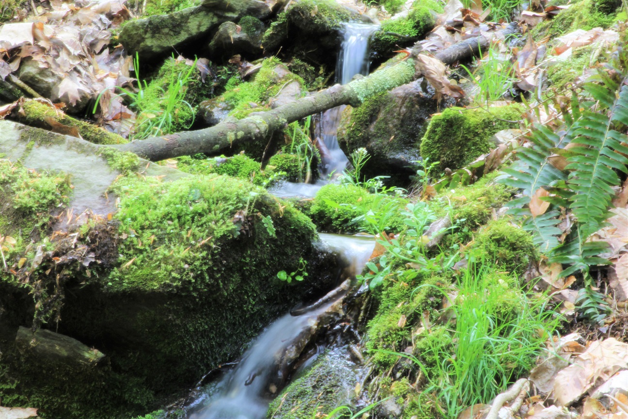 But, small though they may be, the unnamed falls in the woods are the real deal. The terrain here is, very briefly, so steep and rocky that the stream has to descend over the face of a large rock outcropping. The falls even have several tributary streams cutting through the hills just downstream from them.