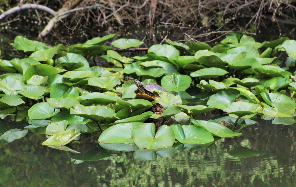 This is by a little manmade marsh next to White Clay Creek which is prime turtle habitat. It’s been a rather cold May so far (it was down in the 40s and raining much of last week), but the day I visited the waterfall it got up into the mid-70s, hence the explosion of reptiles.
