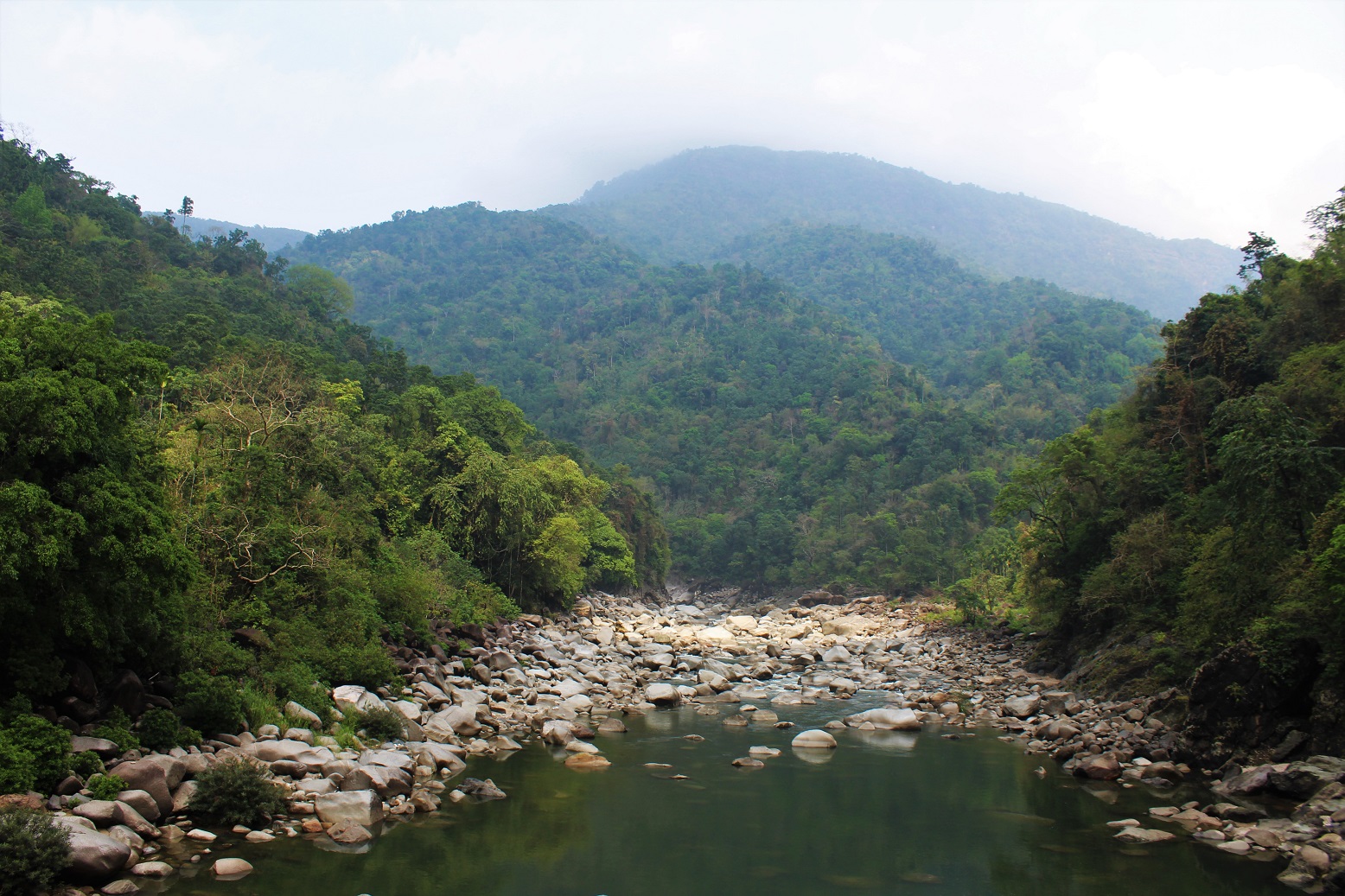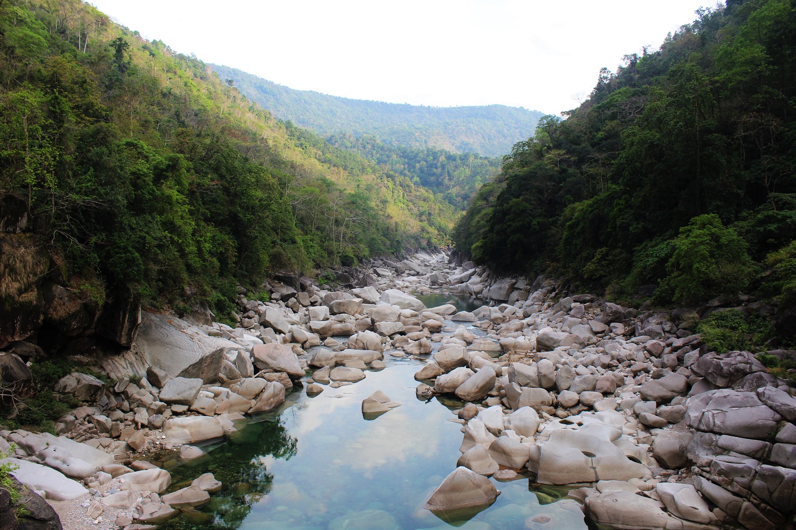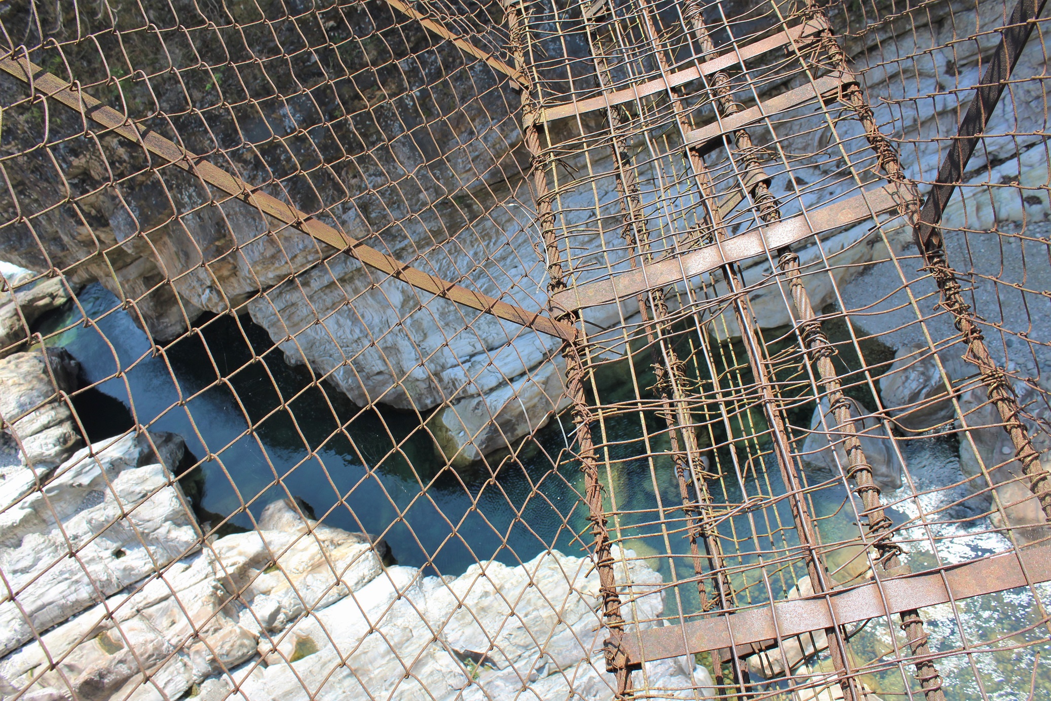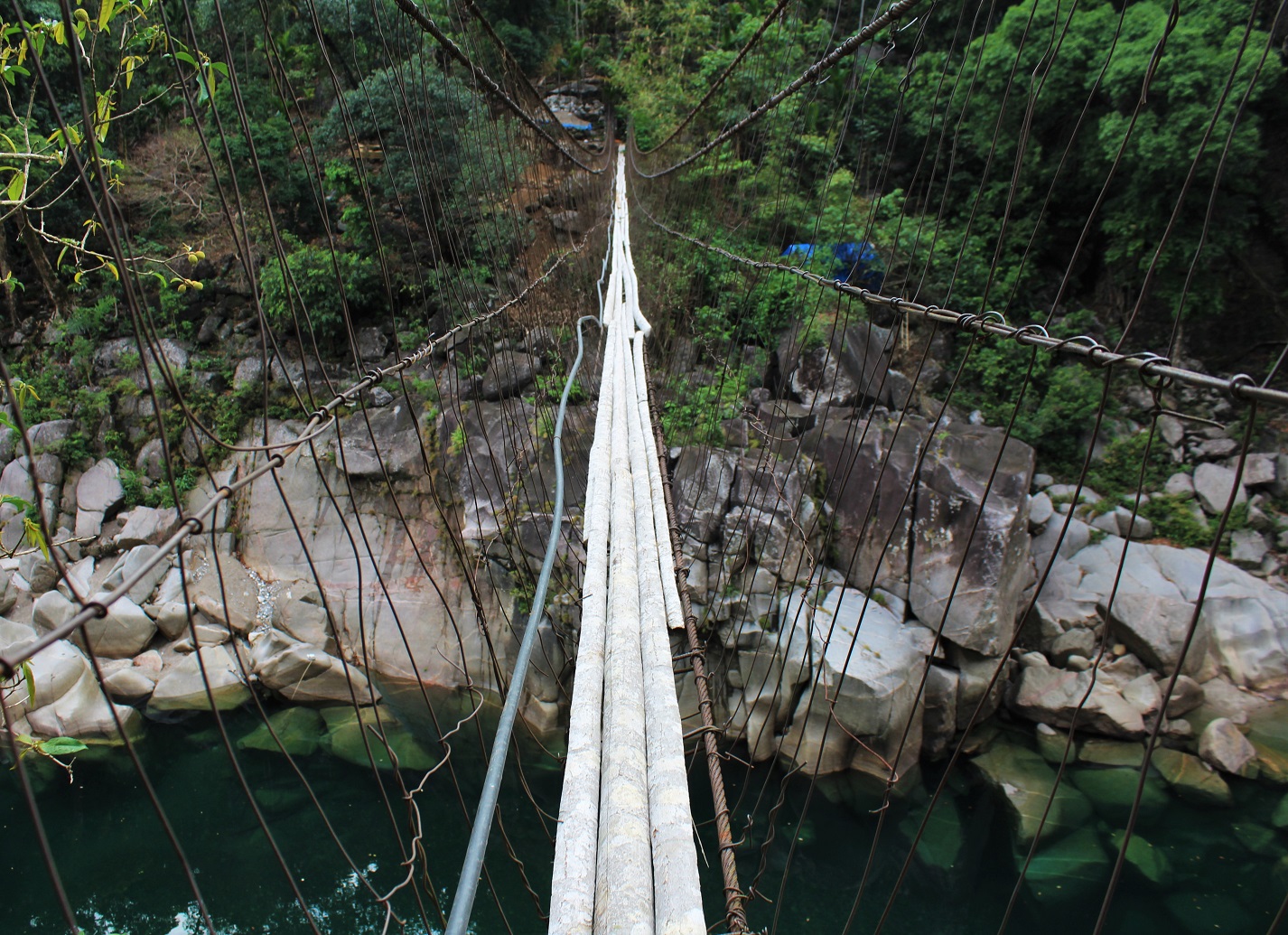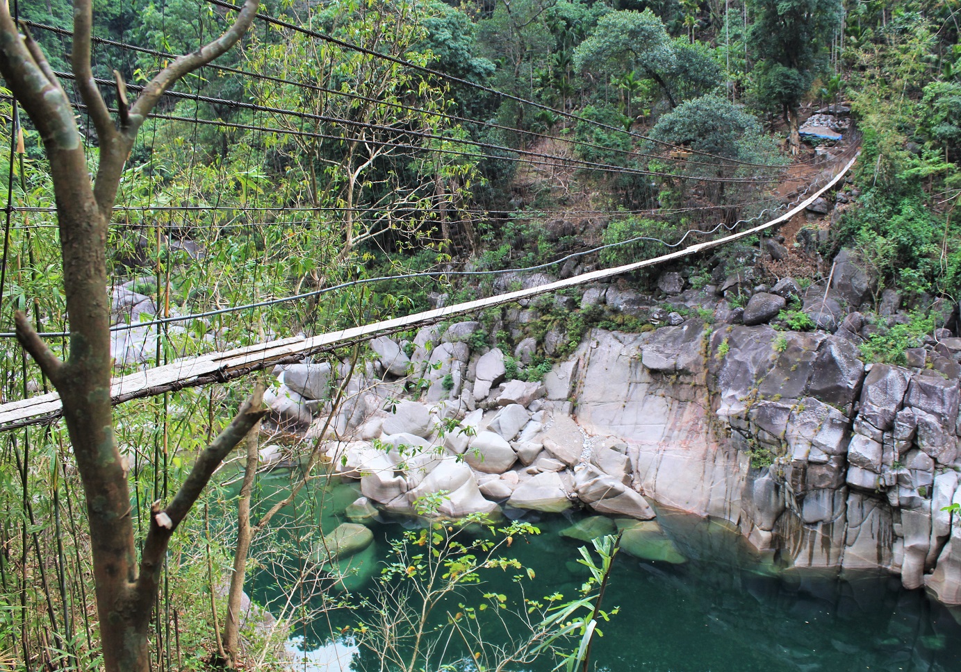The photos below cover bridges in the immense gorge of the Umrew River (you might also see it called Wahrew). As I describe the area in The Green Unknown: “The Umrew gorge is a maze of steep valleys cut by a multitude of rivers and is perhaps the most complex piece of geography in all of Meghalaya. To the west, Sohra sits atop a great flat-topped massif of limestone at an altitude of 4500 feet. Due east, a circuitous three-hour drive from Sohra though it is a mere eleven miles distant as the crow flies, Pynursla occupies its own limestone plateau, at roughly the same altitude. Many tens of millions of years ago, these two vast chunks of fossiliferous stone were one, but then, as the whole Shillong Plateau violently rose, the monsoons and the raging rivers they spawned intervened, separating the two land masses with a deep bowl of many canyons, leaving only narrow fragments of the original tableland. Between the escarpments of Sohra and Pynursla, numerous rivers rush together to meet the Umrew, which collects the last of its Indian tributaries just above the Bangladesh border.