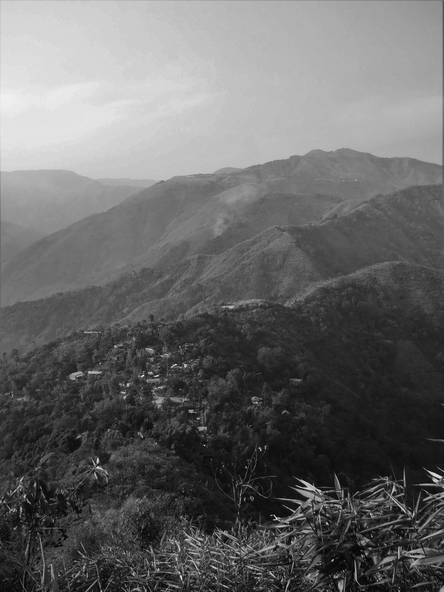 He led the way in silence. The trail took us at an angle downhill and upstream from Mawshuit, along the right side of the Muor river valley. At a surprisingly gentle slope for the Khasi Hills, the path, or rather, the network of faint interconnected tracks, ran through a landscape of tall broom grass and sad expanses of ash and blackened tree-trunks where the jungle had recently been cleared in shifting cultivation fires. With the majority of the forest gone we were afforded a straight line of sight down to the river, which was at this point several hundred feet below. Further upstream we could see that the sides of the valley constricted briefly into a sheer, rock-walled, canyon. It was towards the stony gorge that the ex-headman seemed to be leading me, though I had no verbal means of confirming this.