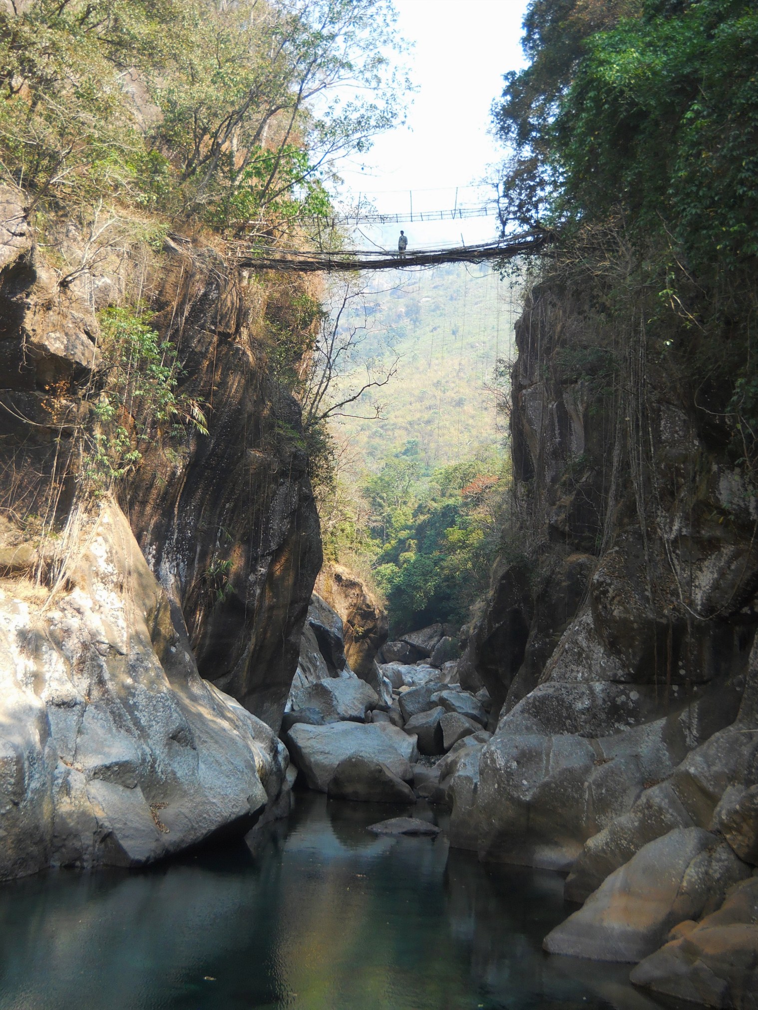 The path brought us to some large boulders in the riverbed, next to a deep, glassy, pool, bounded on either side by the vertical canyon walls. The view from here was an awesome one: The bridge looked even more precarious than it had from above, the roots were like mere threads, and the whole hundred-foot distance from the span to the Muor was taken in at once, with the riverbed and a distant jungle covered slope framed in the rectangular opening created by the bridge above, the river below, and the canyon walls to either side.