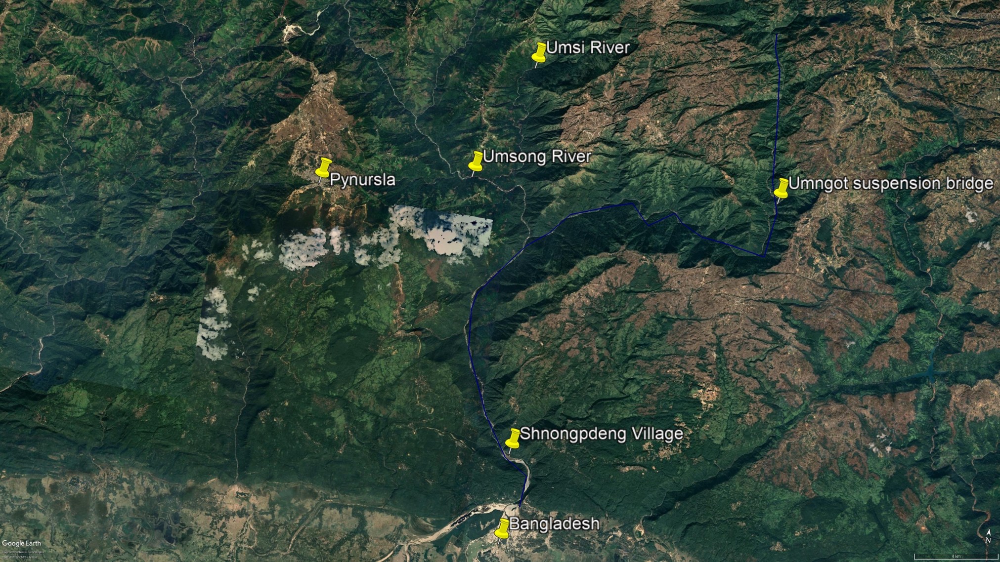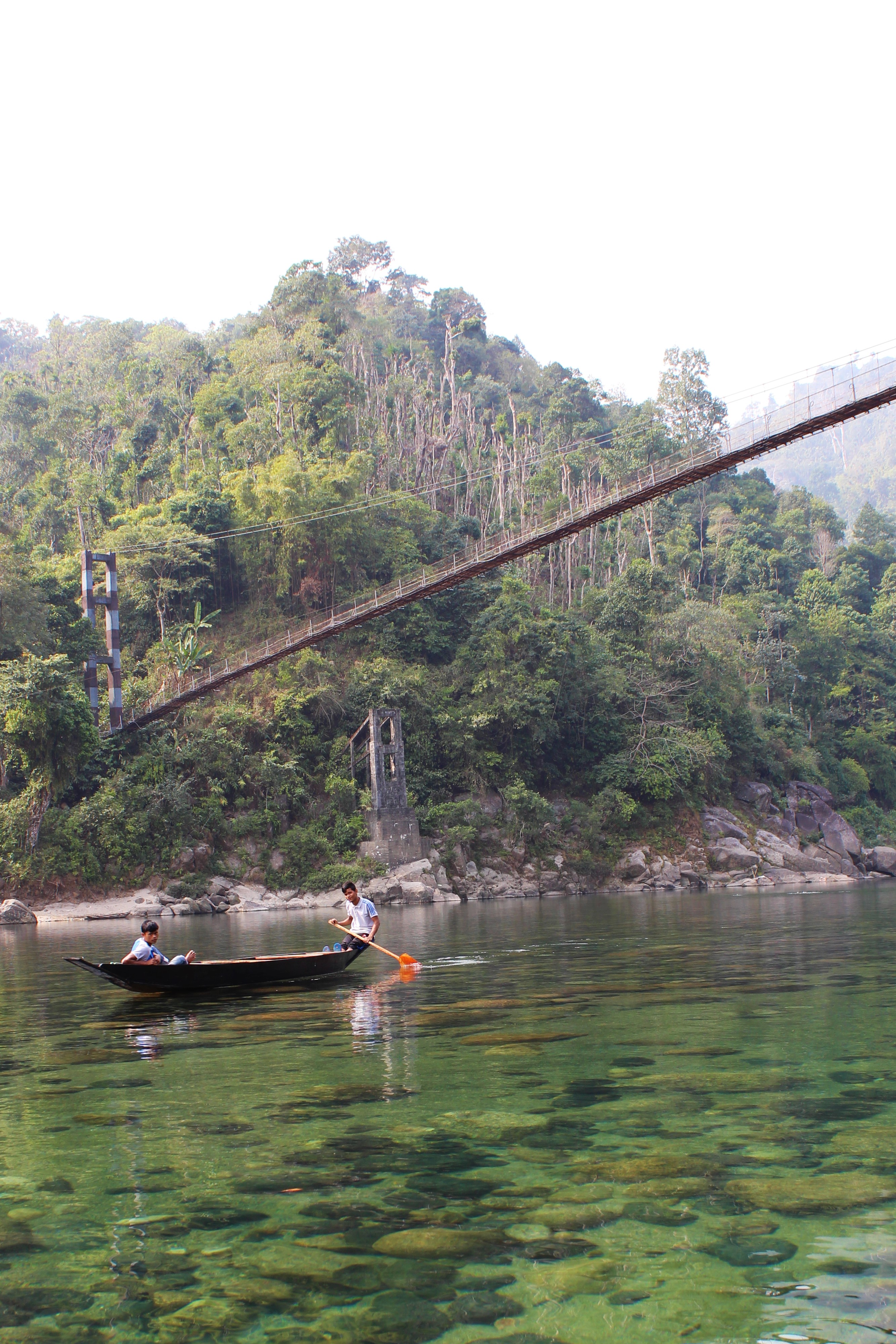 Parts of this region are far from obscure. The border town of Dawki, and the lovely village of Shnongpdeng nearby, are both firmly on Meghalaya’s tourism map. And Shnongpdeng has what is perhaps the most iconic steel-and-concrete suspension footbridge in all of Meghalaya, a 170 m span that crosses the Umngot in its lower, wider, reaches, only a few kilometers from where the river spills out onto the plains of Bengal and becomes a tributary of the muddy streams of Bangladesh as they wind down to the Indian Ocean.