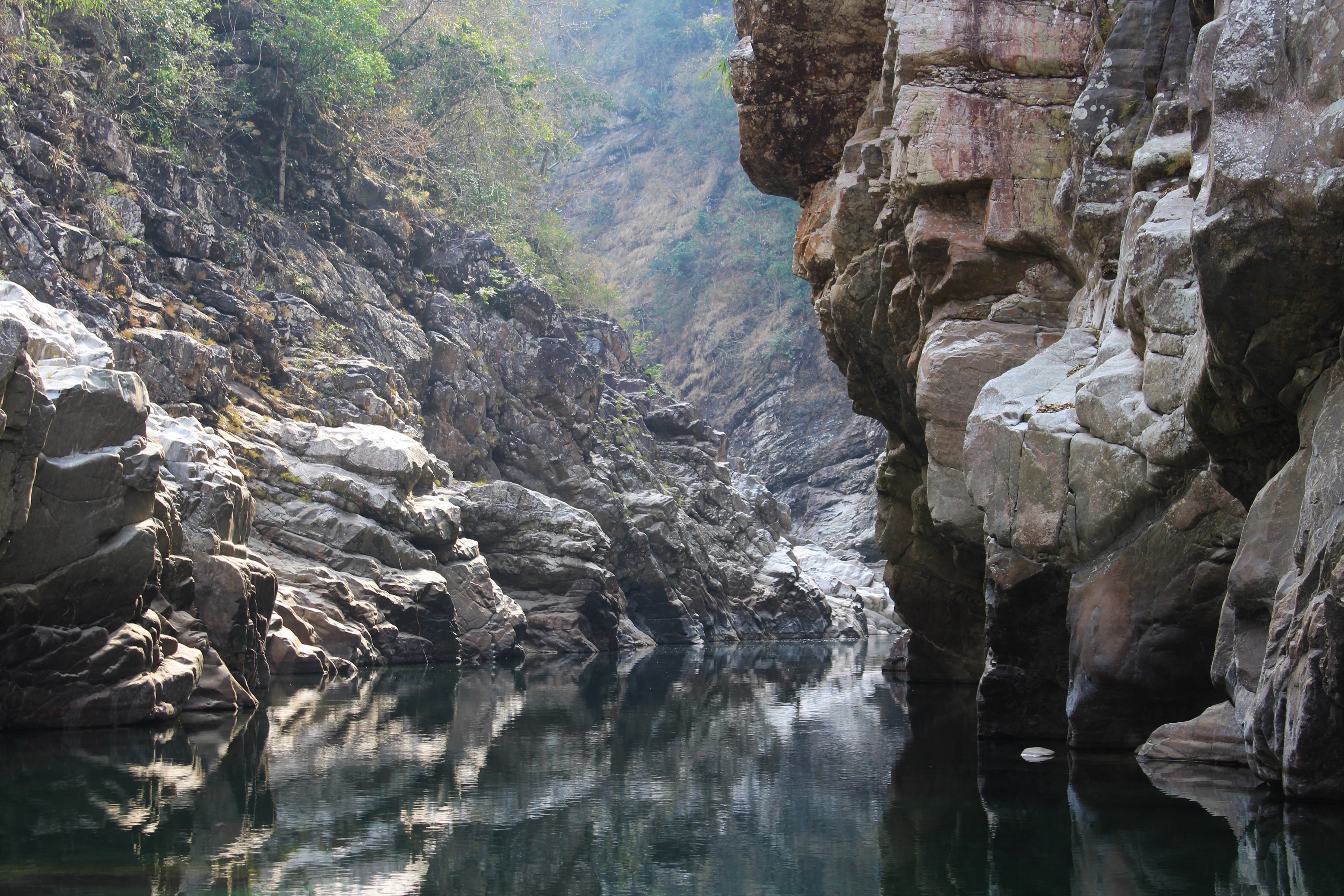 There, at the termination of the Pynursla river, we had reached the bottom of the world. All around us were great stony cliffs. Resting partially submerged in the deep, clear, Umrew, were vast boulders, the tops of them protruding above the surface like the peaks of icebergs. These had come from every stratum of rock above, brought down over the millennia by landslides, earthquakes, and innumerable monsoons. Huge pieces of weirdly eroded limestone full of marine fossils stood side by side with chunks of sandstone and colorful conglomerates. But the sheer stone of the cliffs, carved from the basement rock of Riwar, was vastly older than any of these. Even the higher strata of the Shillong Plateau are only as recent as the Mesozoic, and the fossils they contain are hundreds of millions of years old. But the deep, Precambrian stone that enclosed the Umrew comes from the very dawn of life on Earth. And now, after all the billions of years that stone had been in existence, here we were, one Phareng and three Rangthylliang Khasis, our little lives but infinitesimal pieces of a far, far, greater story.