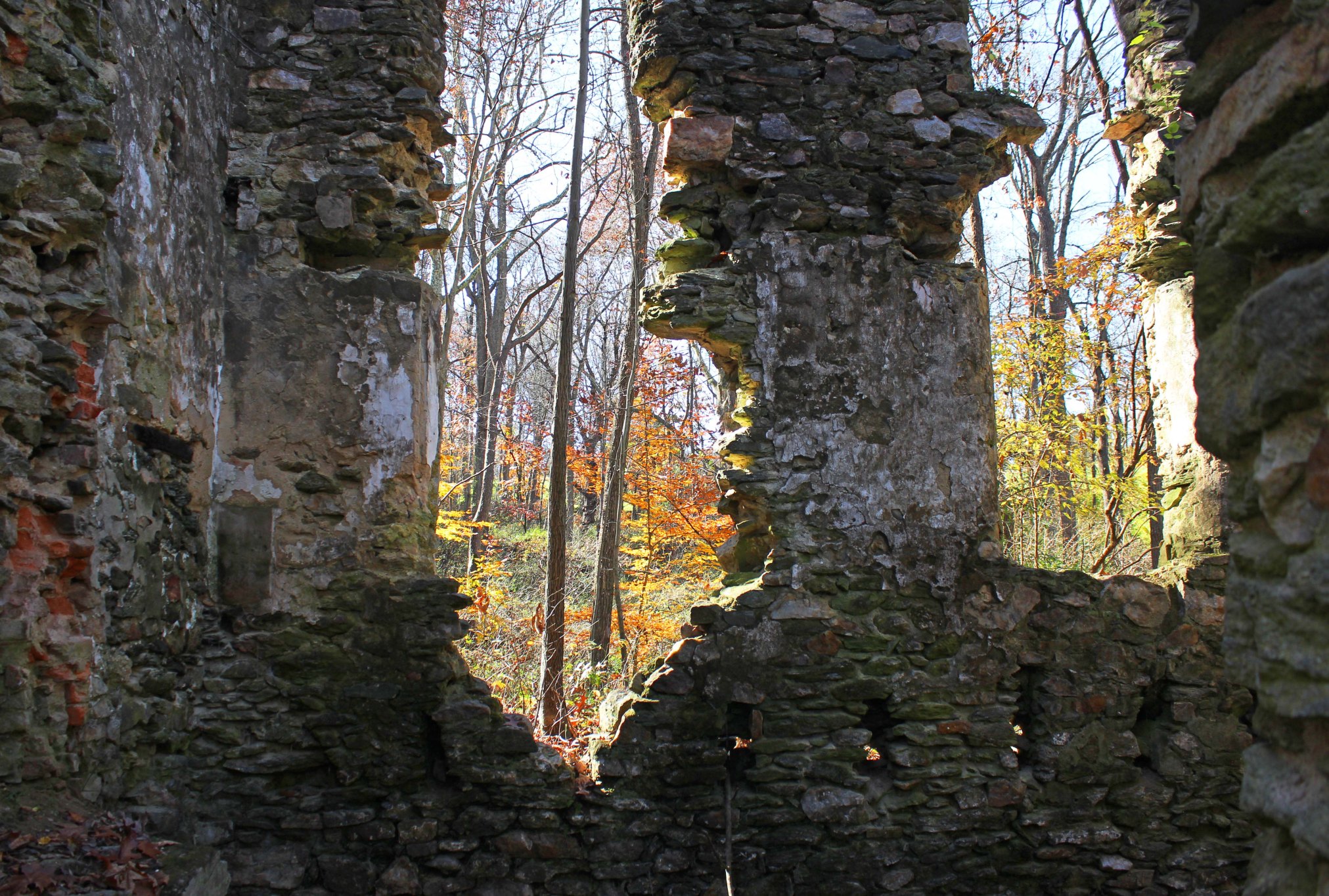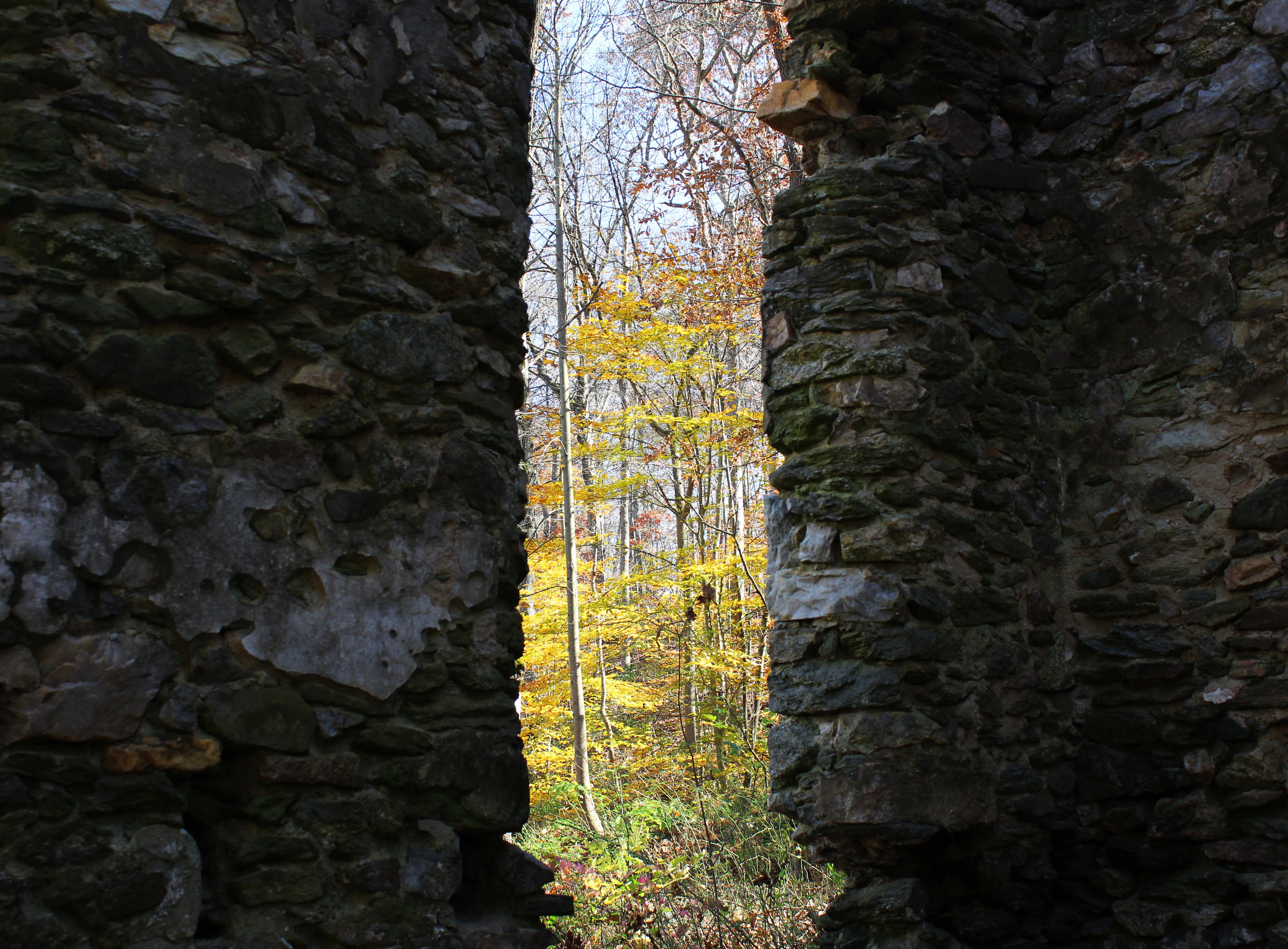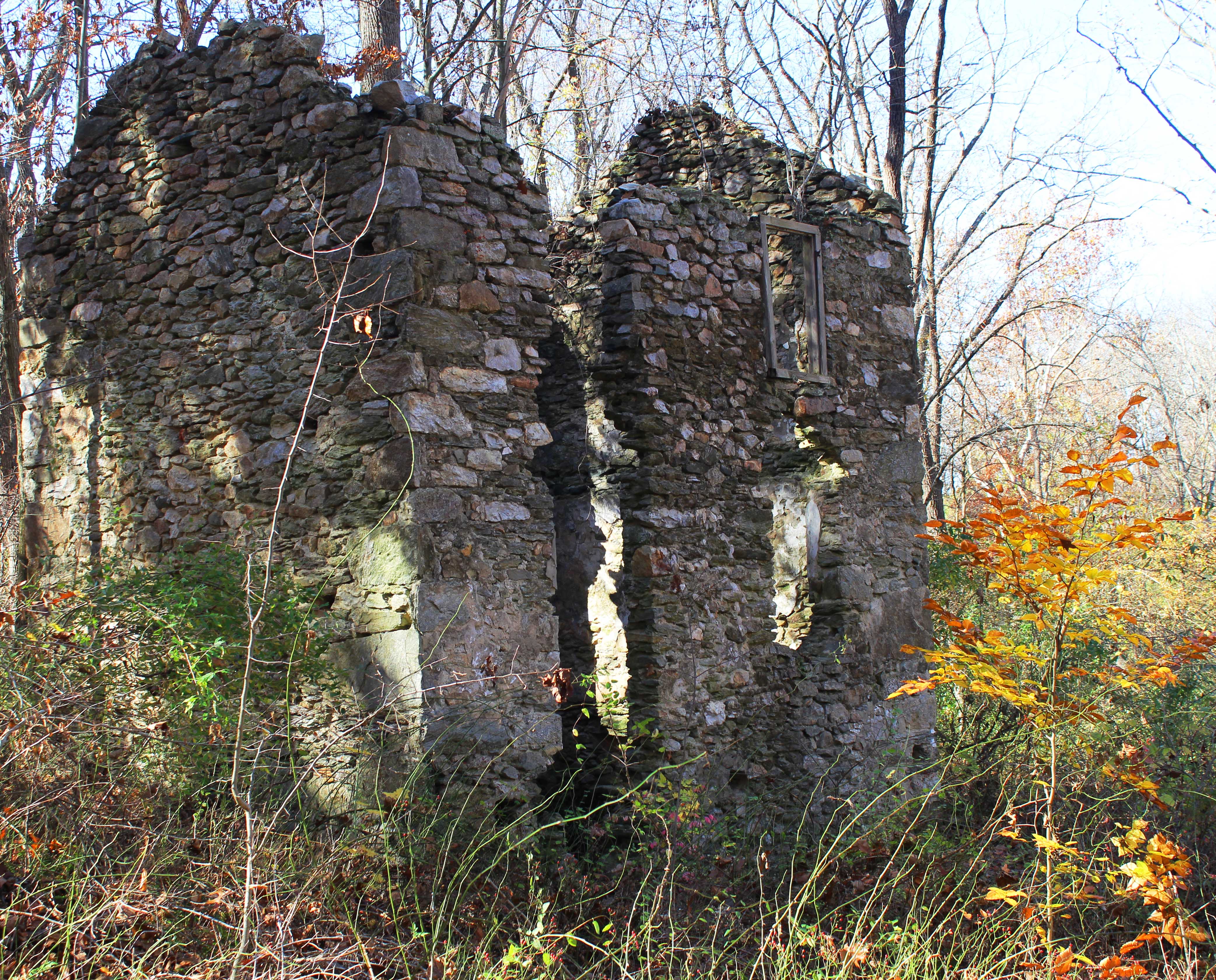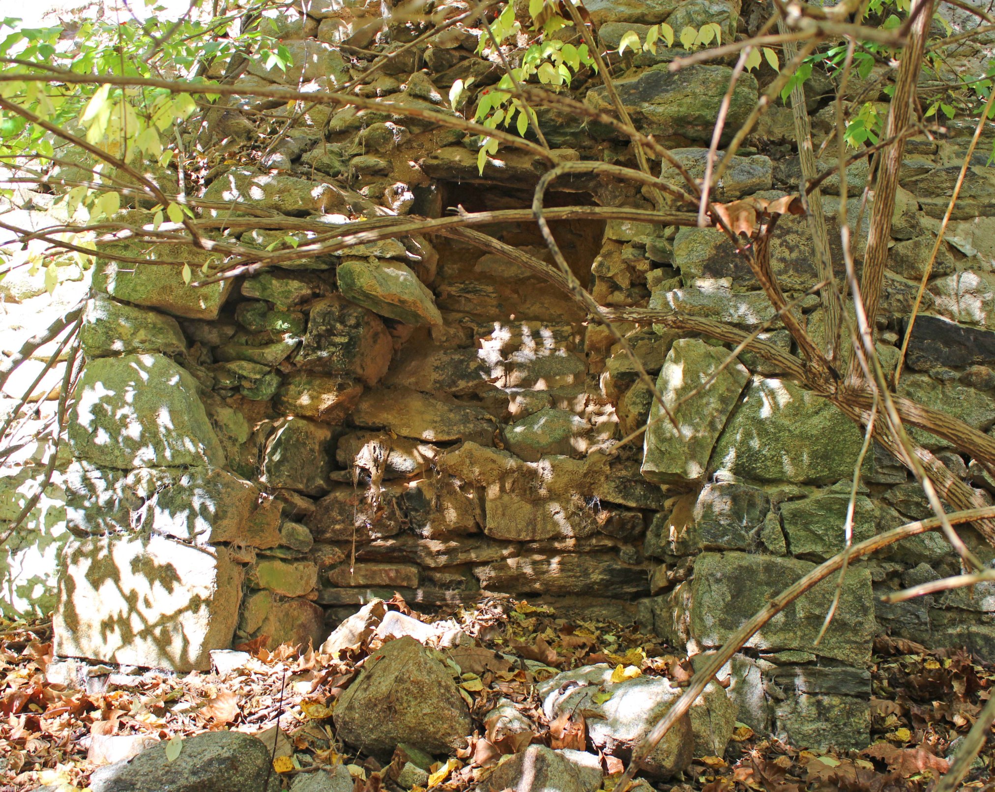 The path also passes by an extensive group of ruins that are thought to be the remains of the 19th century Springlawn papermill. Here’s a painted 1894 map of the mill, however I can’t say which bit of ruins corresponds to which structure shown in the painting. The most prominent ruin next to the trail appears to be a two story residential structure not depicted in the map, so I’m not sure what its relationship to the mill was. If anyone has any more information on the subject, I’d be interested to hear from you.
