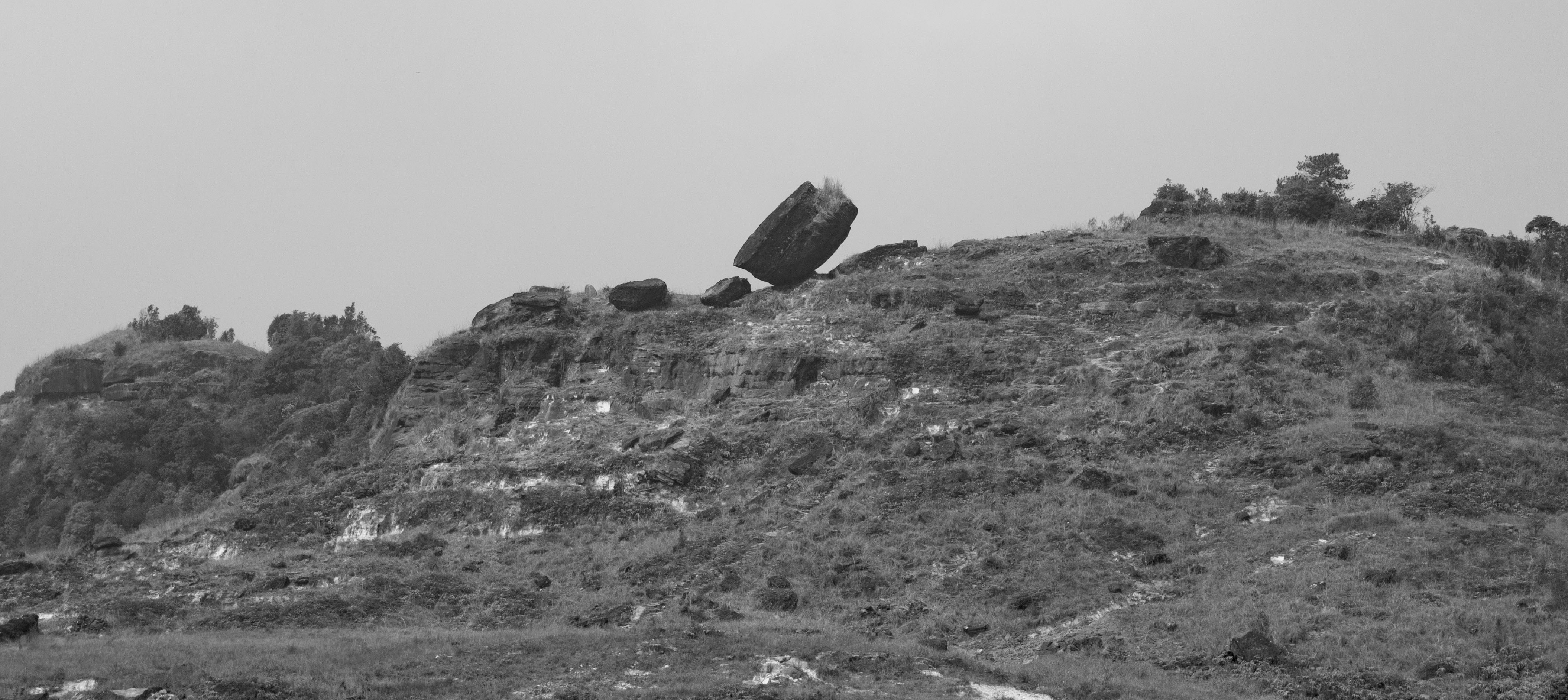 The balanced rock of Syntung village, however, appears to defy all these explanations. While it is clearly a great hunk of the same limestone that makes up the land around it, the boulder is also, mystifyingly, close to the summit of the hill it occupies. The landscape itself gives no indication as to how such a giant rock could have rolled down from elsewhere; there’s nowhere higher that it could have rolled down from. It also does not seem to be an example of where a softer layer was eroded out under it; the material the boulder rests on is the same as the boulder itself. In another landscape it would be tempting to attribute the rock to a receding glacier. However, to my knowledge, glaciers never covered the Khasi Hills.