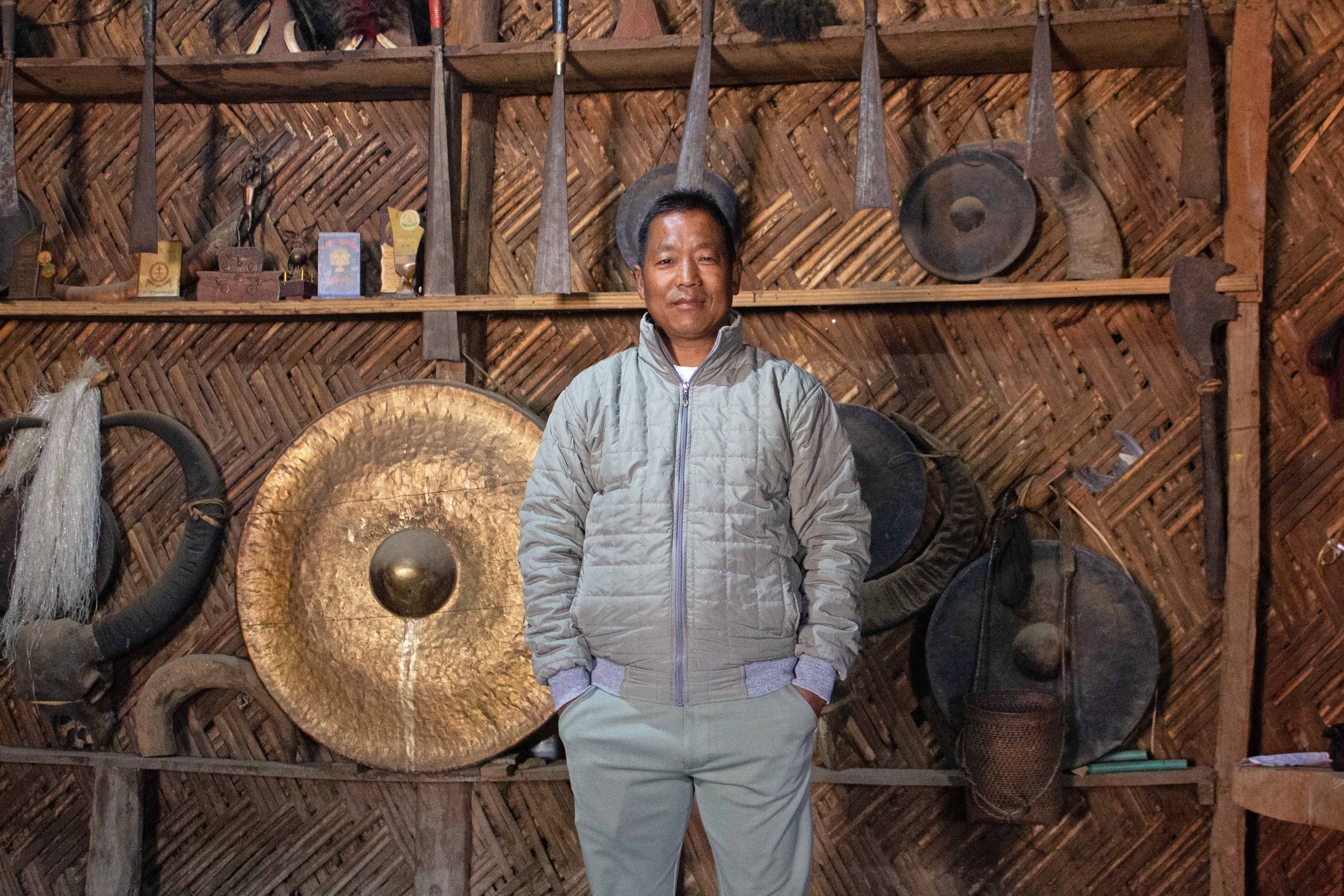 Aloh, the great Angh of Longzang, stands in front of antique ceremonial knives, traditional gongs, a buffalo skull, and some trophies from local civic and cultural associations.