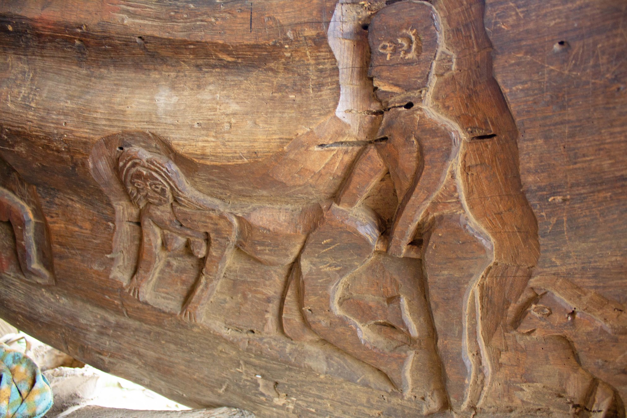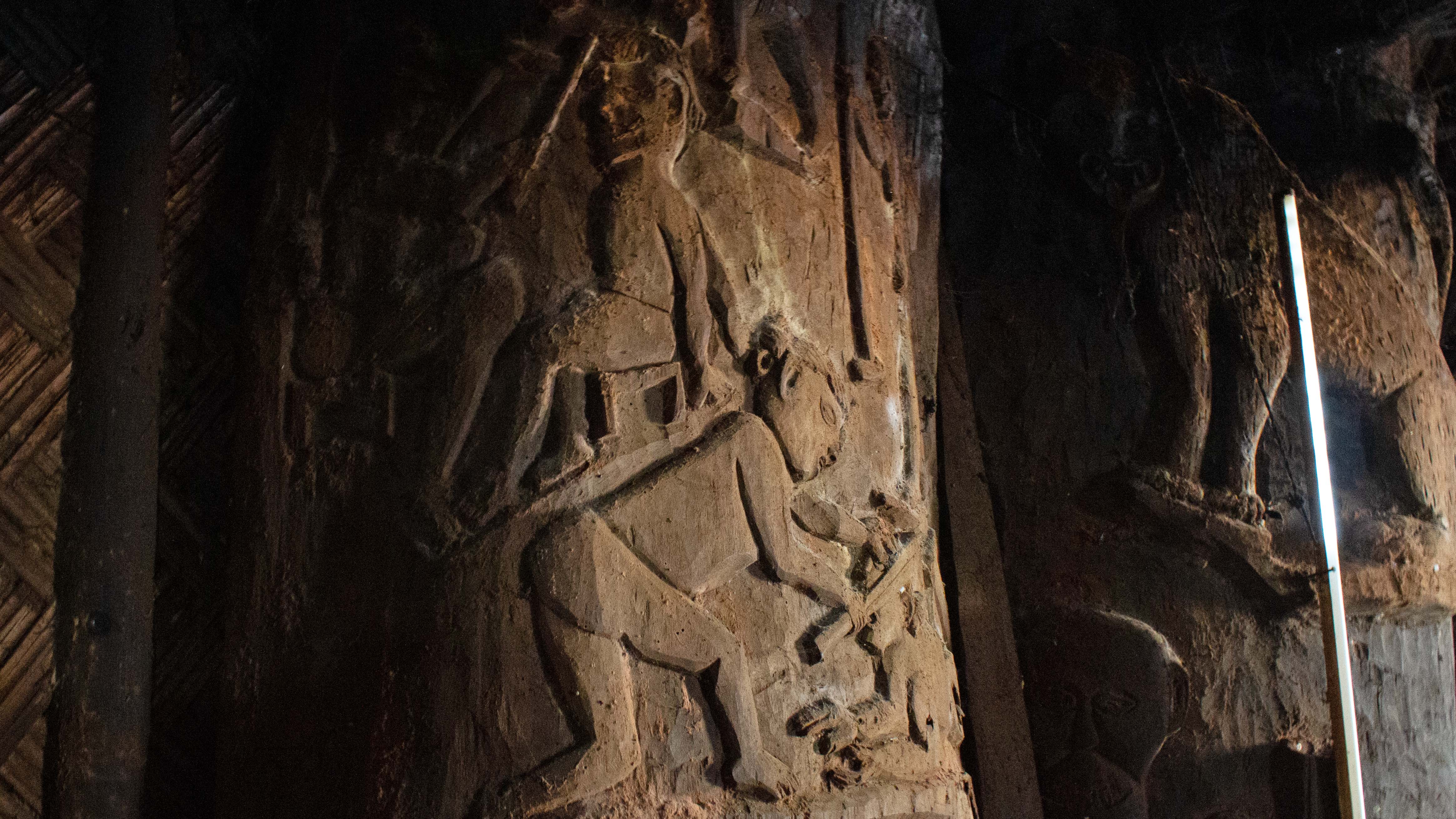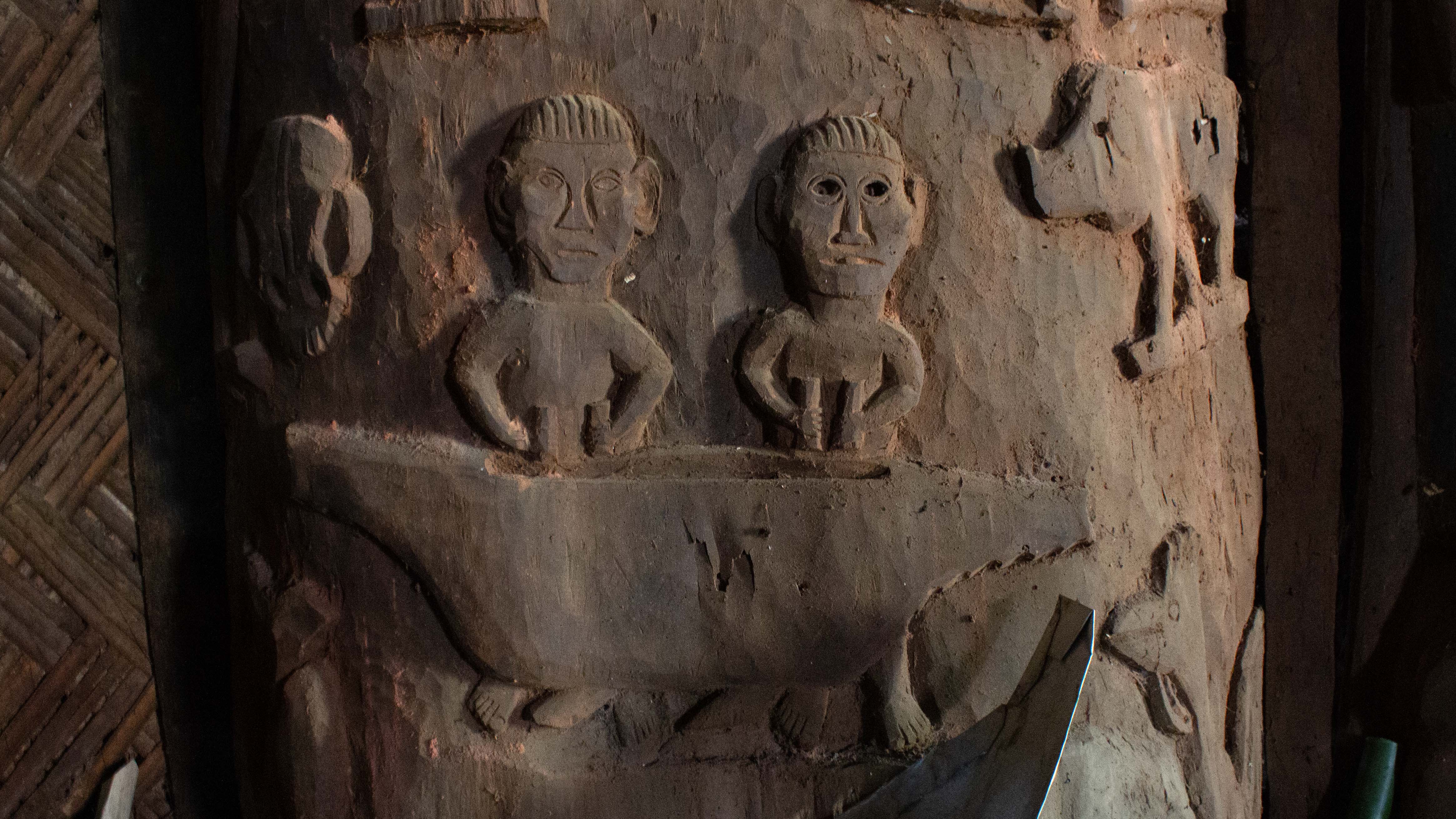 Shoved to one side of the longhouse was this collection of wooden figures, some of which appear to be quite old, along with a large panel depicting a hunting scene.