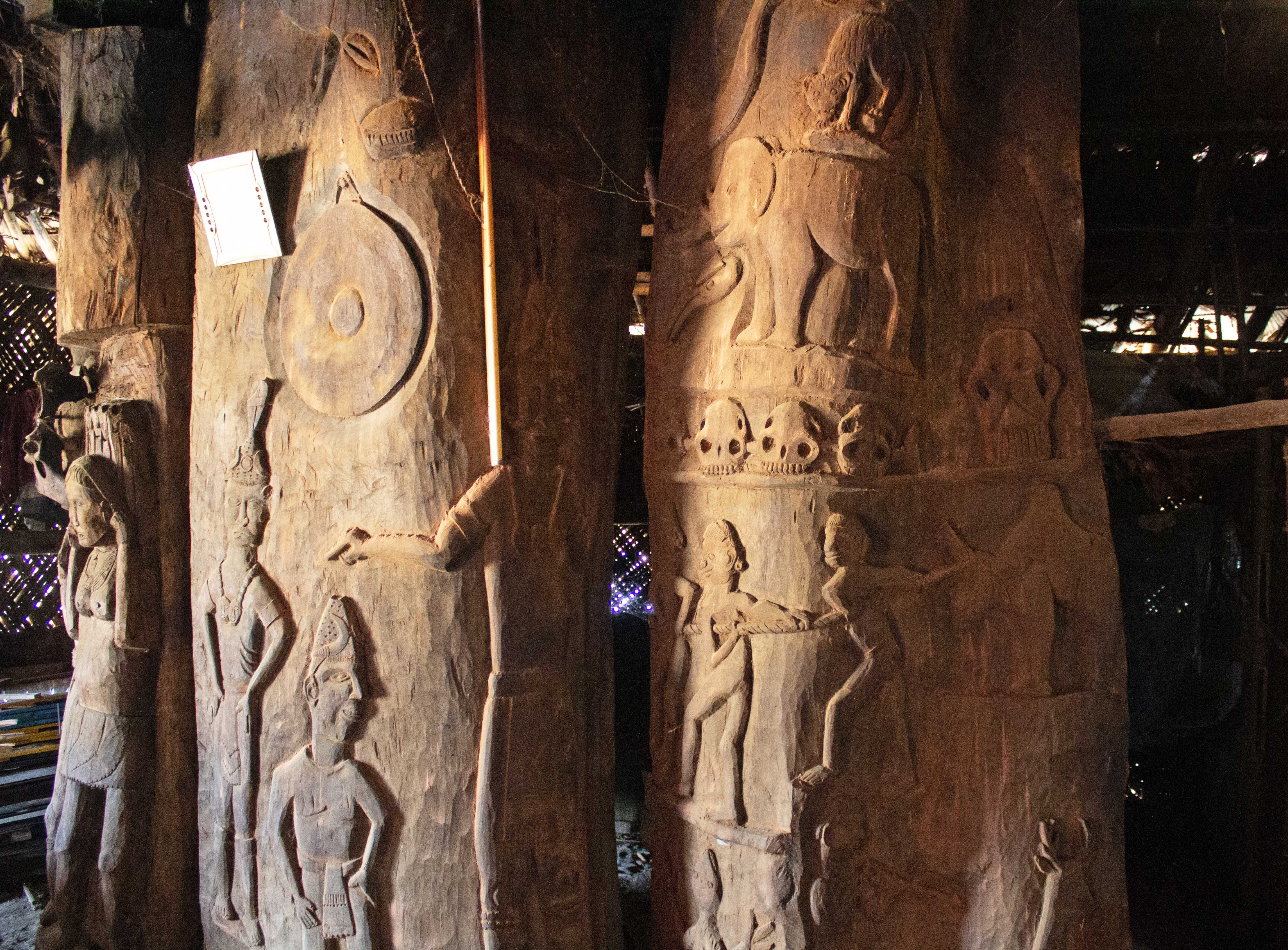 Without even seeing inside, it was clear to me that the residence of the king of Longzang was a remarkable piece of Konyak culture. The outside of the massive structure was covered in dozens of great buffalo skulls, and there was a huge wooden carving made from a single tree trunk resting outside which depicted hunting scenes and a giant python.