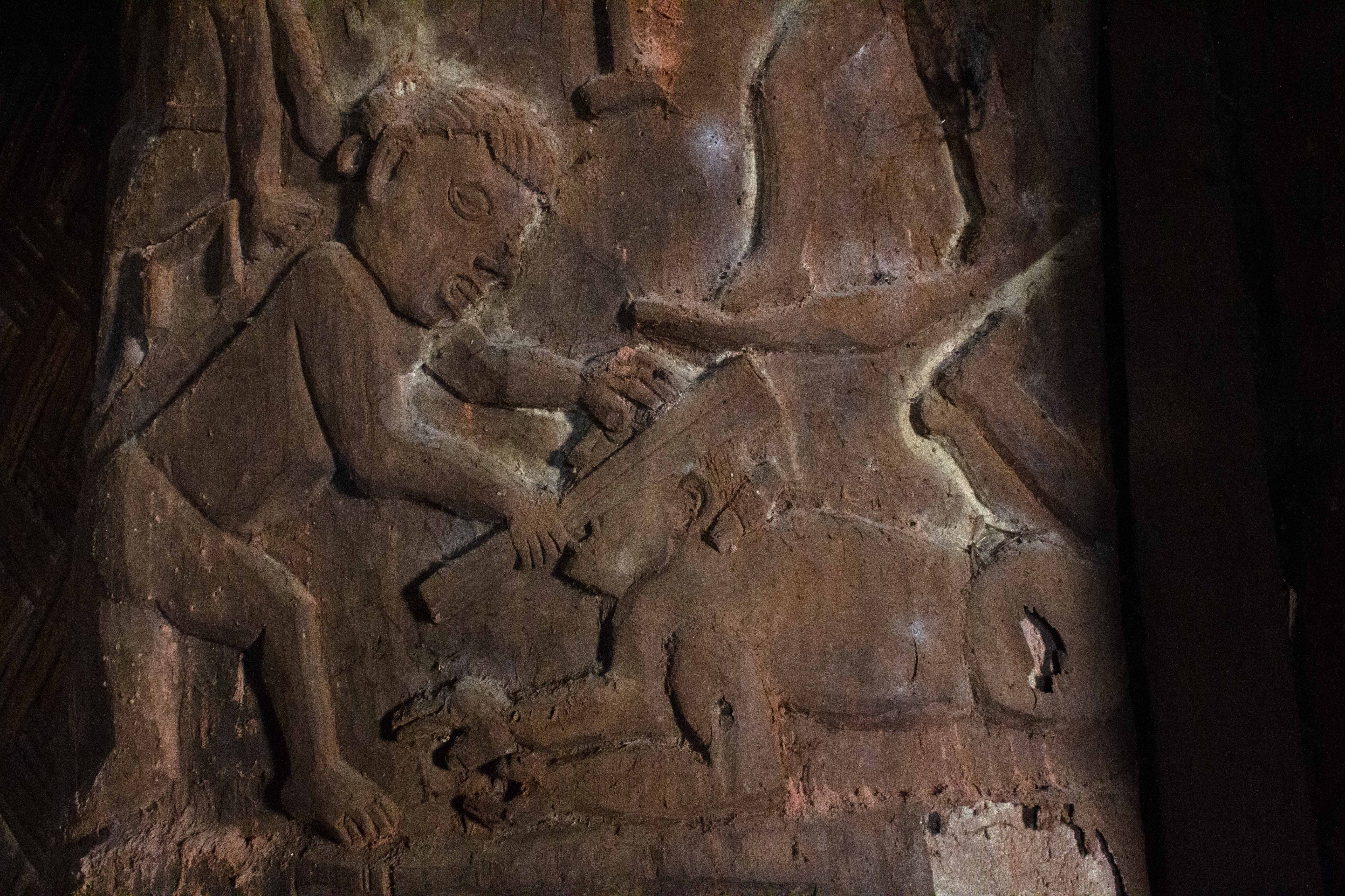 Wooden panel showing captives being beheaded.