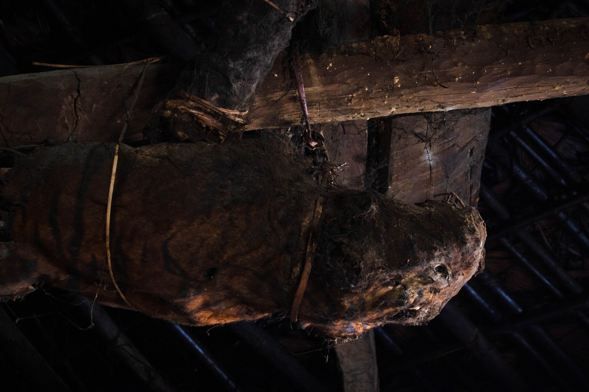 An ancient stuffed tiger. It had seen better days. The skin was tied to a beam on the ceiling up in the darkness, and I had spent several hours in the longhouse before I even noticed the long-deceased creature’s desiccated face gazing sadly at me. The dim, atmospheric lighting in the house meant that the whole time I was there I kept noticing new artifacts tucked away in dark corners.