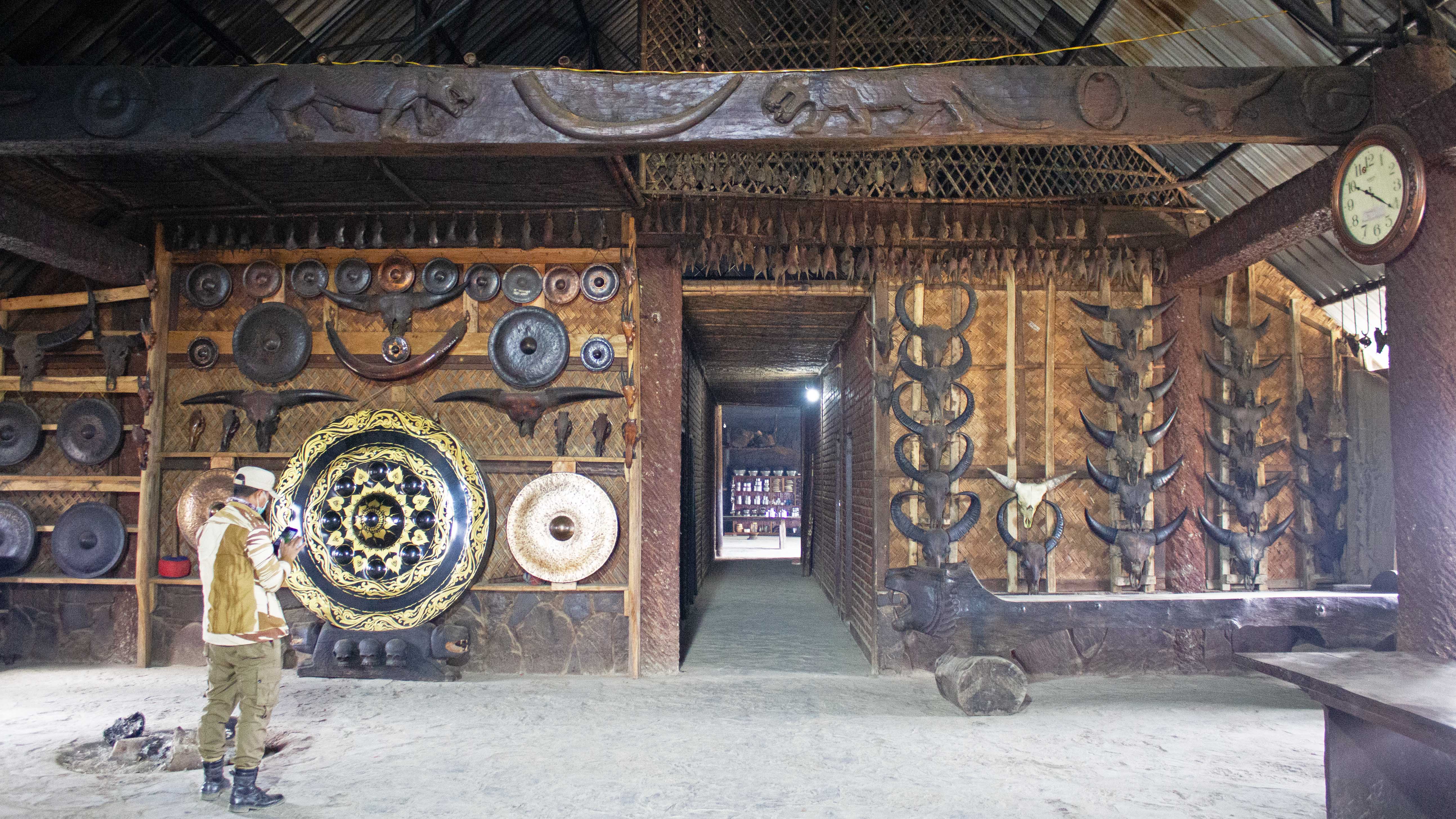 Impressive artifacts on display, including ceremonial gongs, mithun, goat, and wild boar skulls, along with an elephant tusk.