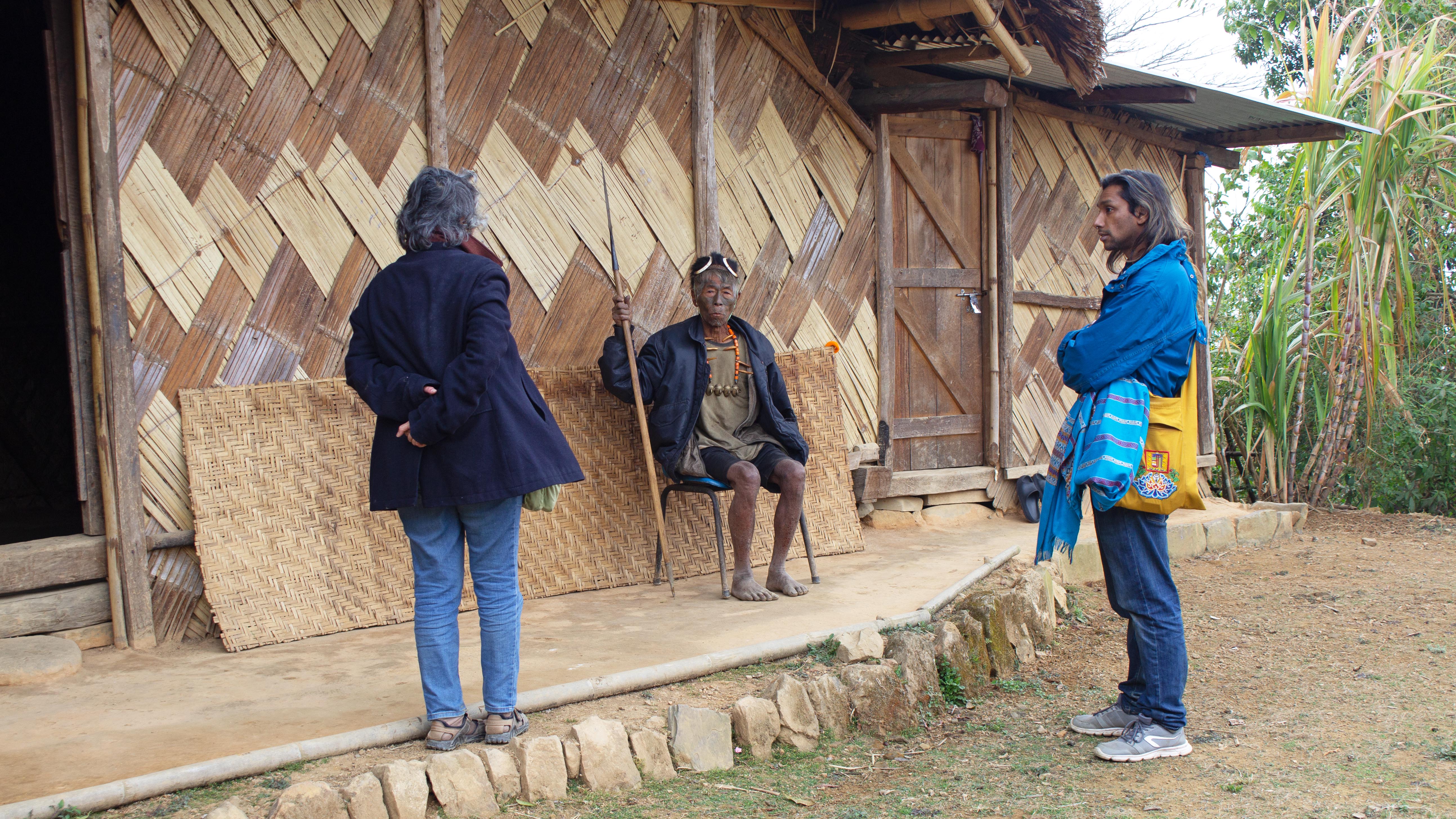 On the last day I was in Longwa I wound up tagging along on a short tour of the village that one of the other guests at my homestay had arranged with a South Indian photographer based in London. Our guide was a young Konyak named Mansheih, who had a personal relationship with most of the surviving tattooed headhunters in the village. He had their phone numbers (or their relatives’ numbers) and so could call them up whenever curious outsiders were enroute. This gave the old guys time to don their dusty traditional warrior gear and prepare to start posing before the tourists showed up, as they had countless times over the past 20 years.