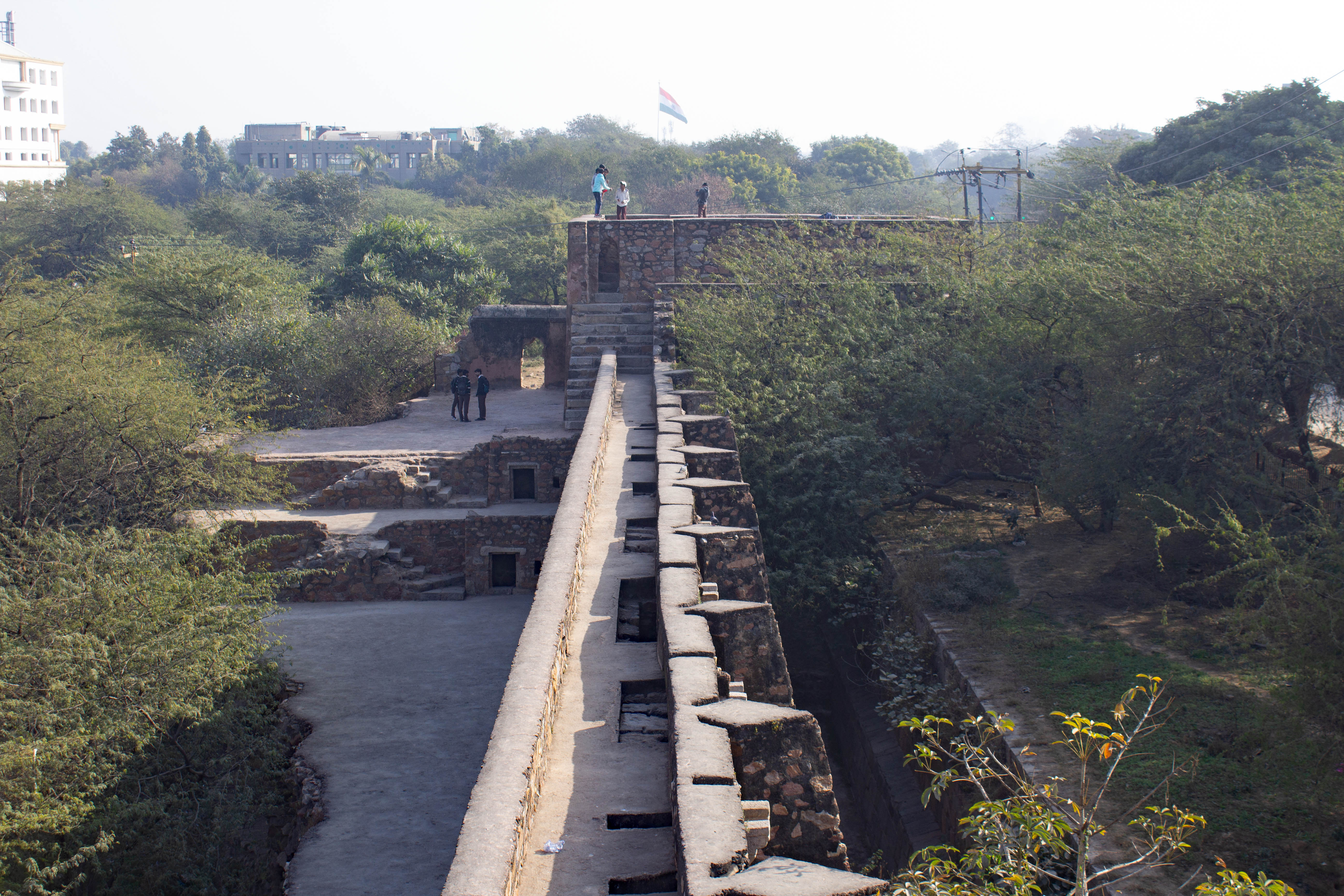 However, there is one point where the fortifications of Muhammad Tughlaq’s capitol were presumably made stronger than elsewhere, and so have managed to withstand the ravages of history and urban growth. This was at Satpula, where the battlements passed over a small stream (which has since been diverted off to the east). A dam was built here, behind which a lake developed. As the fortifications were naturally perforated at this location, the dam was designed with defense in mind. A moat was dug in front of the structure’s sluice gate, while a system that lowered wooden boards to block off the dam’s water tunnels was put in place both to keep water in and invaders out. The dam was provided with a fortified parapet along its causeway from which soldiers could repel any attackers bent on forcing their way through, along with two large bastions at either end which could serve as barracks. What might have been a natural weakness in Jahanpanah’s fortifications was thus converted into a strong point, and now, over half a millennium later, this is one of the few places where the battlements of Muhammad Tughlaq’s city survive.