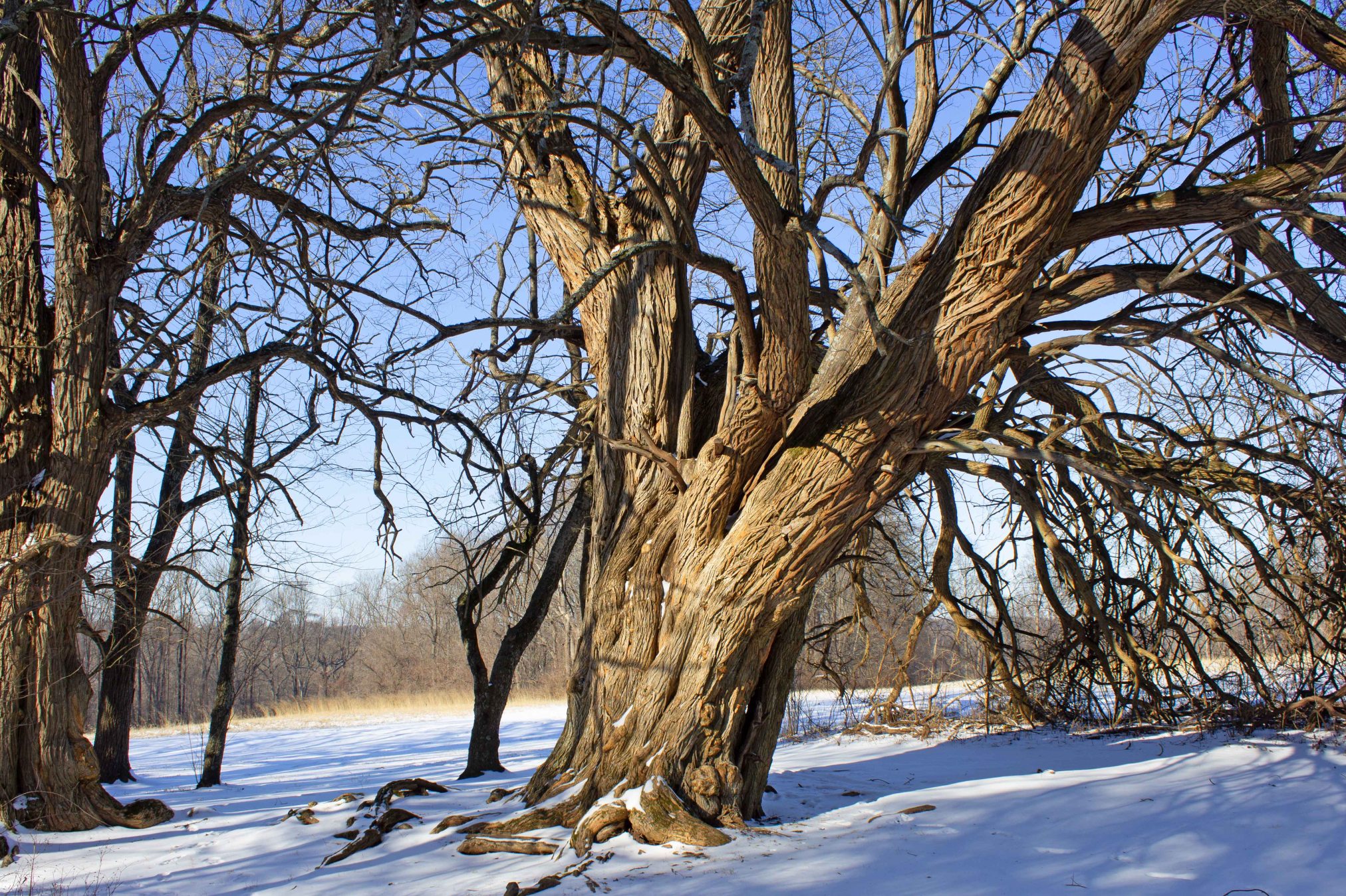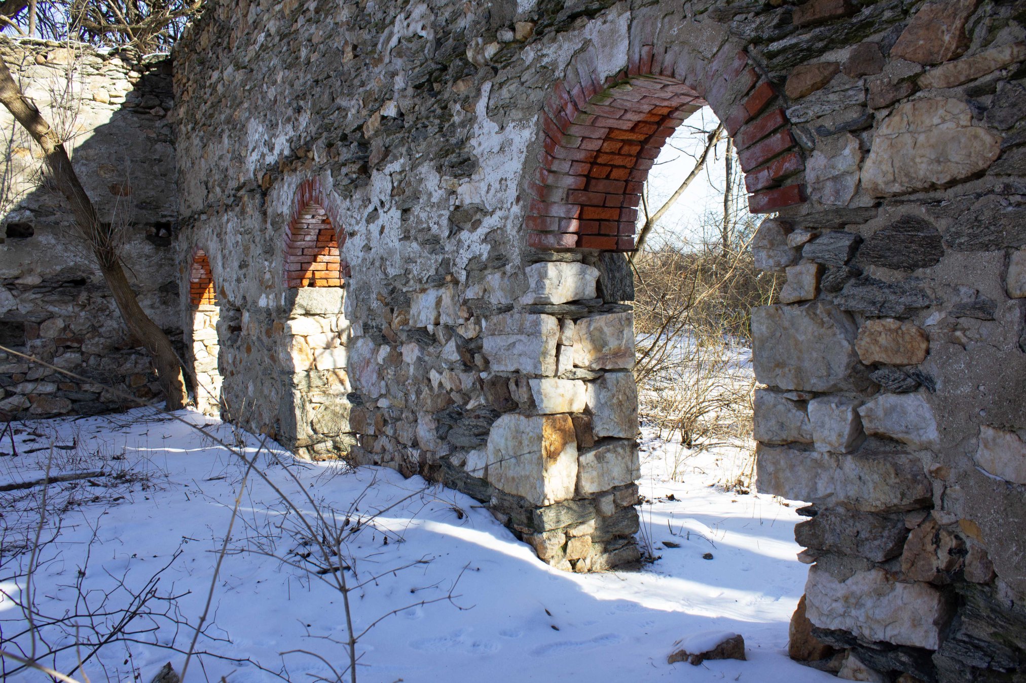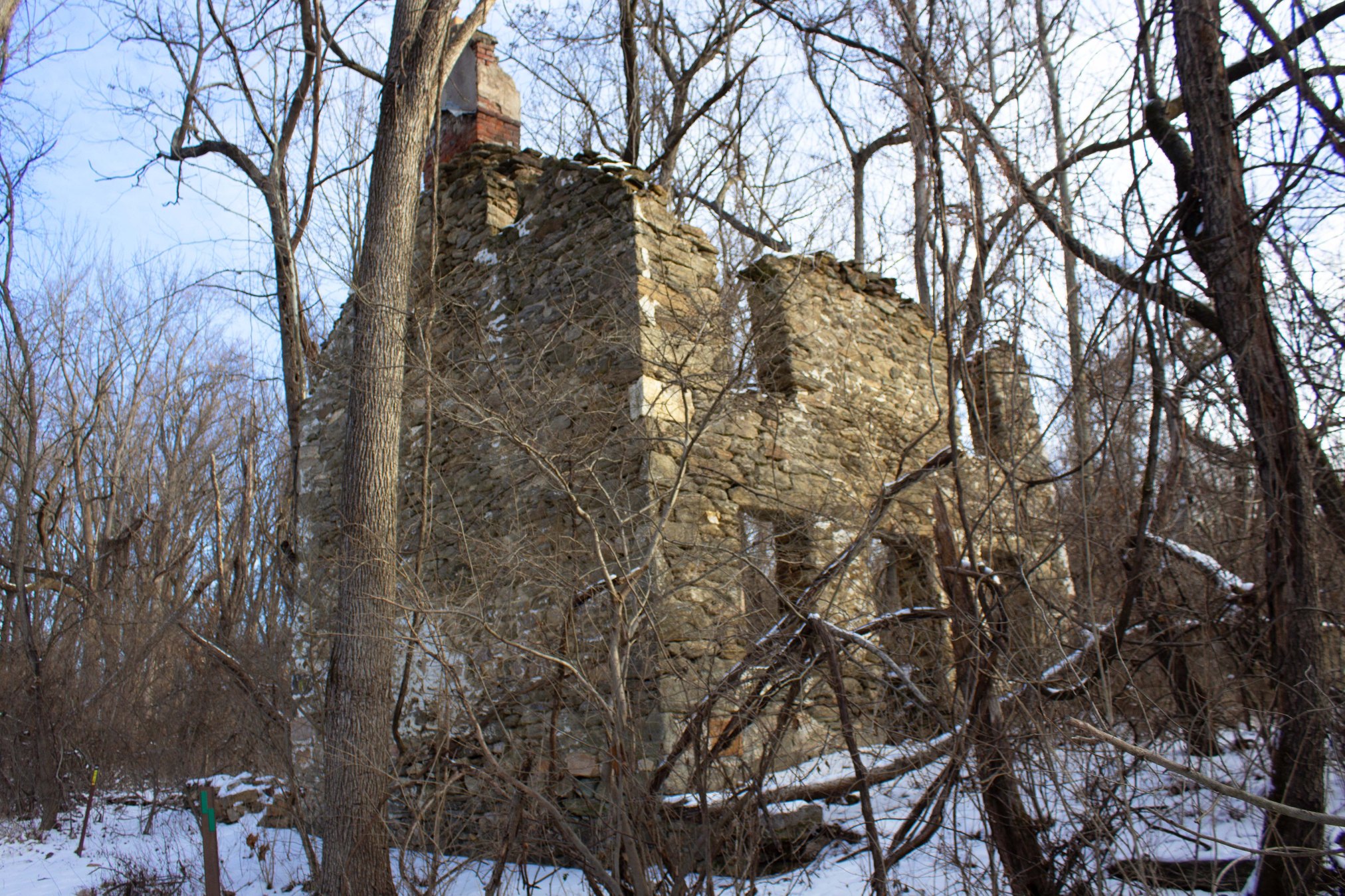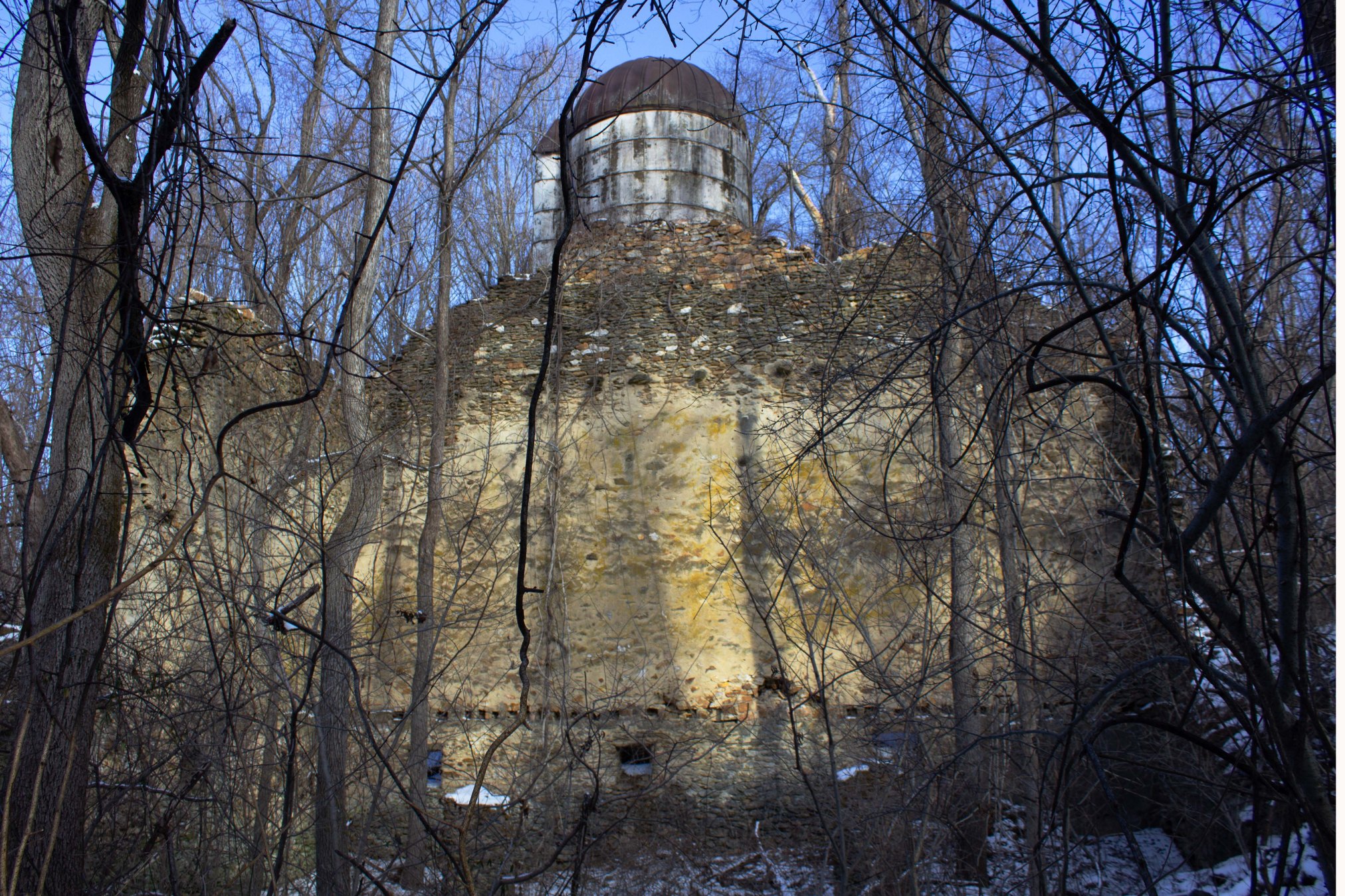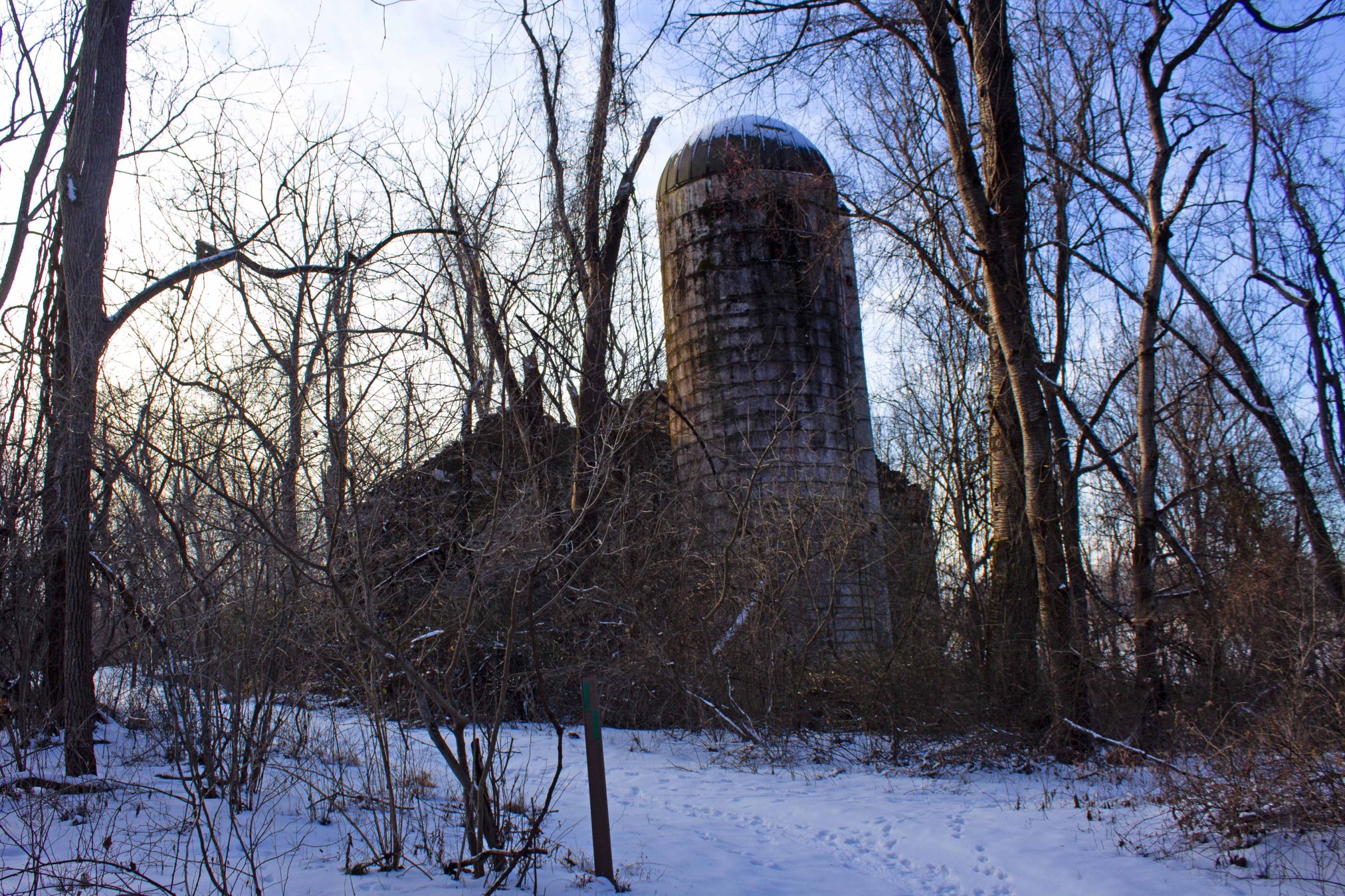 Ruins of the Alexander Tract. The Alexanders were a Scotts-Irish family who came to America in the late 17th century for religious freedom. They went on to establish one of the largest farms in what would later become Fair Hill. The house above only dates from the 19th century, though it was built on the site of a significantly older structure. Looking into the ruins. Note that you can see where the second floor was, and where the beams that would have held up the floor/ceiling went.Ruined barn and grain silo, which is next to the Alexander house.This is one of the most extensive ruins in all of Fair Hill, though it’s full of trees and underbrush which make it difficult to visit. When you go by this spot in the summer, the ruin is mostly obscured by vegetation, so you get no idea of just how big it is.Creepy cosmic horror vision inside the grain silo. A much smaller ruin about a mile and half down the trail. This is the McCloskey Barn, which was built in the early 19th century, and was still a going concern into the 1930s, when the Dupont’s bought up the whole area as a private equestrian preserve (having in many cases simply hired the farmers who were already working the land to keep on farming it). Say what one will about the DuPont’s, but the fact that there are surprisingly large chunks of public park land around Northern Delaware and Cecil County is chiefly due to their conspicuous consumption.Scenic archwayA large Osage orange tree. These are not native to the area, but instead were planted here to serve as hedges and boundary line markers. A random fellow hiker once informed me that this was the largest Osage orange tree in Maryland. Sadly, I think he was mistaken, as I can’t find anything confirming this online. Still…this is an awfully big Osage orange tree.An outcropping protrudes over Big Elk Creek. This is one of my favorite spots in the Fair Hill area. It’s actually about a third of a mile across the border into Pennsylvania, so it’s technically part of Big Elk Creek State Park, though it was still part of the DuPont’s landholdings. The frozen Big Elk RiverOh Deer