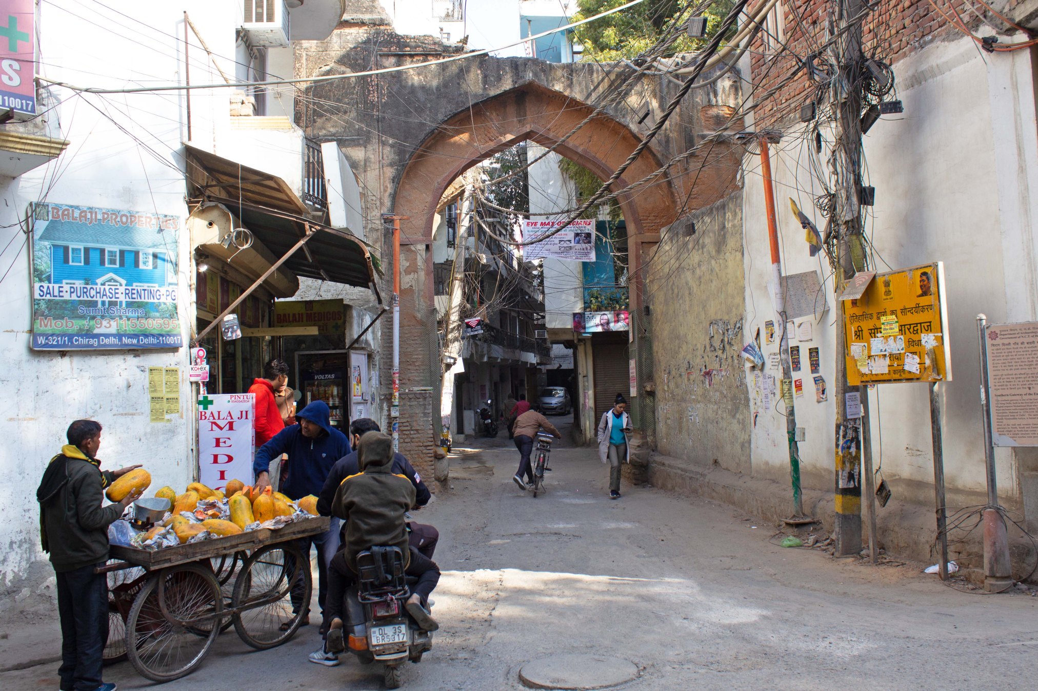 15th century masonry and motor bikes. Only a few generations ago, Chirag Dilli was a village out on the environs of Delhi, surrounded by forests and agricultural fields. But Delhi grew around the village, swallowing it with an IIT campus, shopping centers, and upscale neighborhoods. Yet, inside Chirag Dilli, the layout of the streets, which were not planned for automobiles, hasn’t changed. As a result, the preferred means of conveyance inside the village remains motorbikes rather than cars.