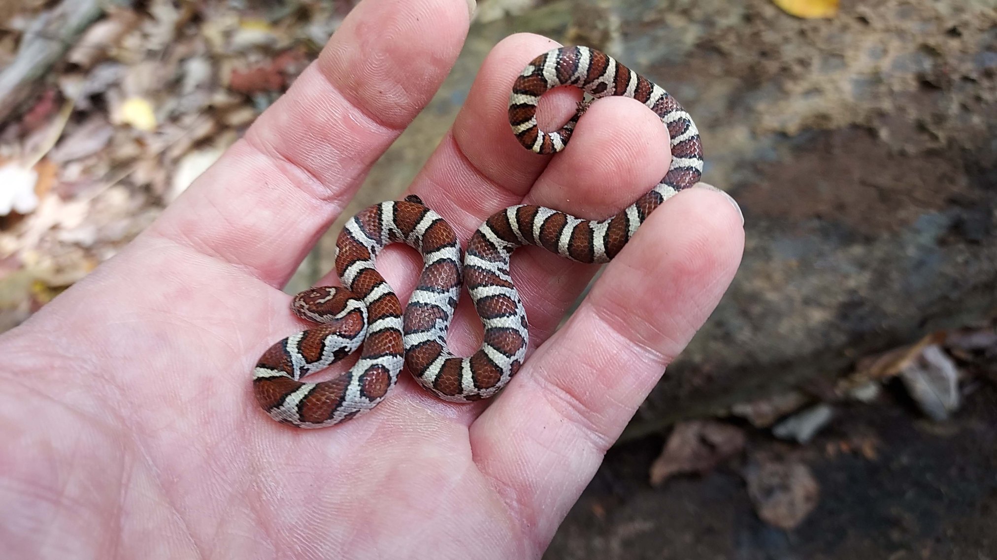 Young milk snake. These are a very common species, but where I live in Delaware is right on the eastern fringe of their territory, so I rarely see them. Funnily enough, I located this fellow under a stone that I had flipped over on a previous expedition and found another milk snake of about the same size. I guess it’s the perfect milk snake rock.
