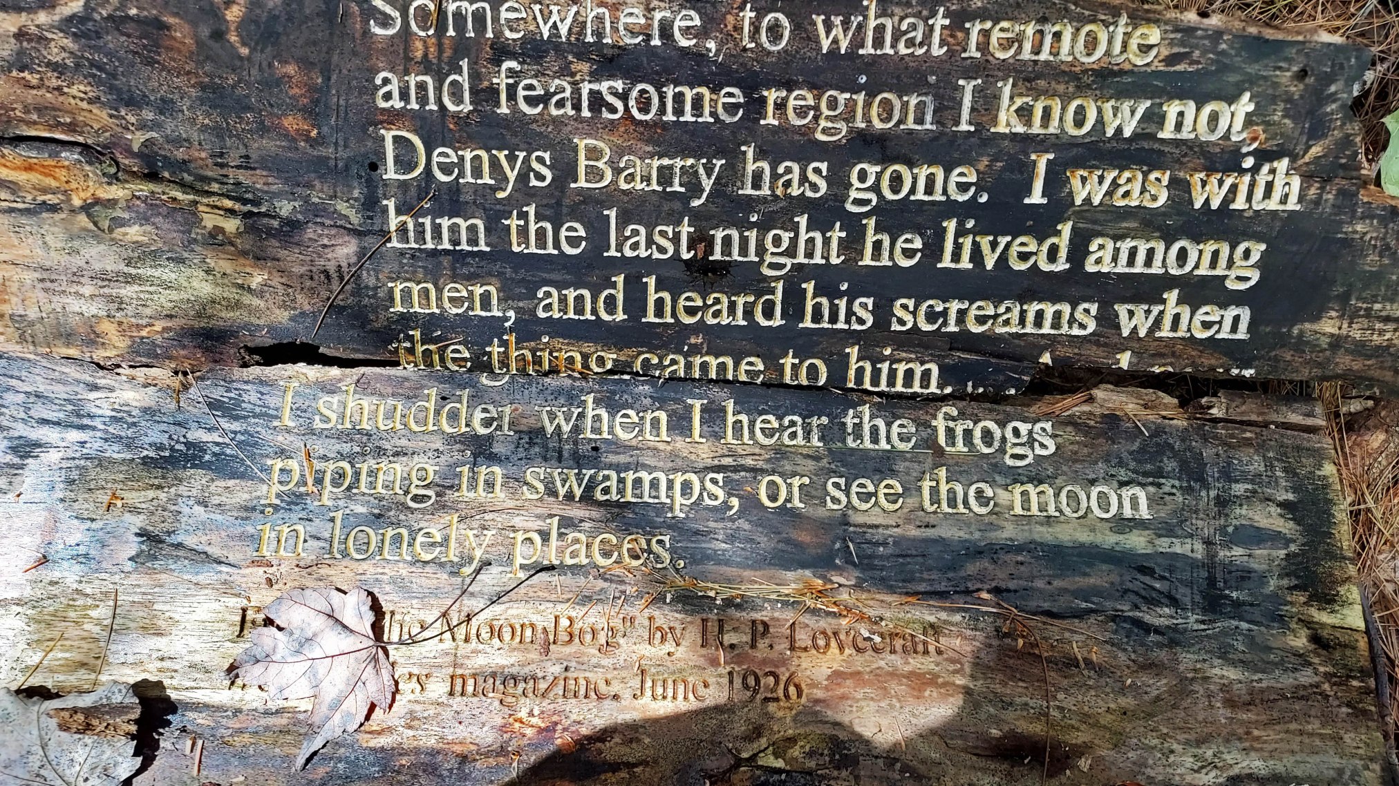 I guess some wag thought the atmosphere would be further spookified by this random quote from the early, Irish-tinged H.P. Lovecraft story “The Moon Bog.” The wooden board was originally attached to a sign, but the board fell down long ago and broke, leaving a weird cryptic H.P. Lovecraft quote miles from civilization in the middle of the woods…I promise this isn’t a weird dream I had.